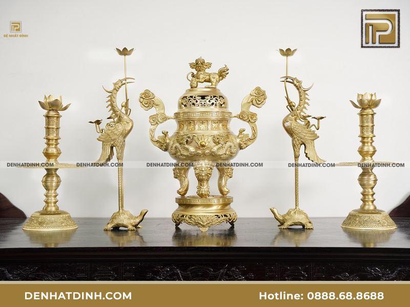 Bên cạnh đỉnh đồng, Đệ Nhất Đỉnh còn có đầy đủ các đồ thờ cúng bằng đồng như bát hương, chân nến, hạc đồng để bàn thờ của bạn được hoàn thiện.