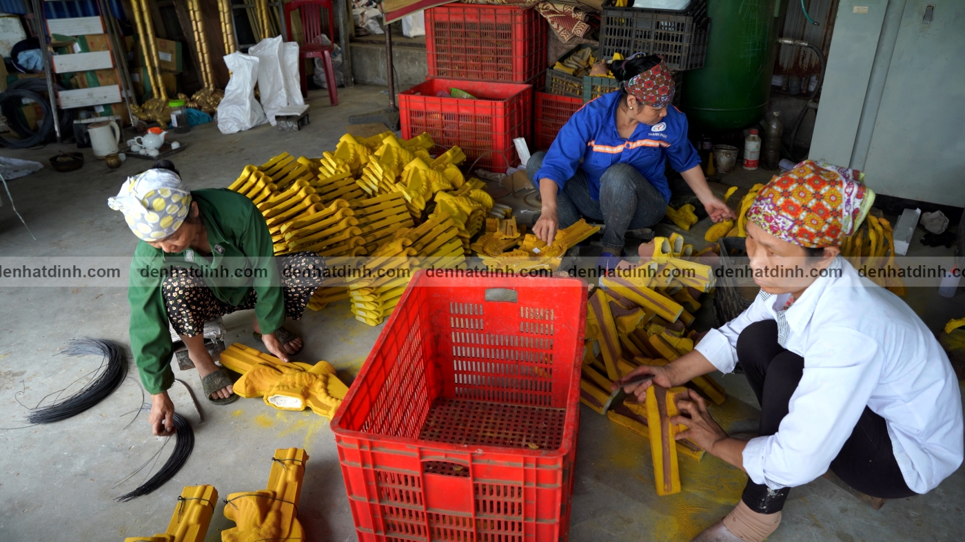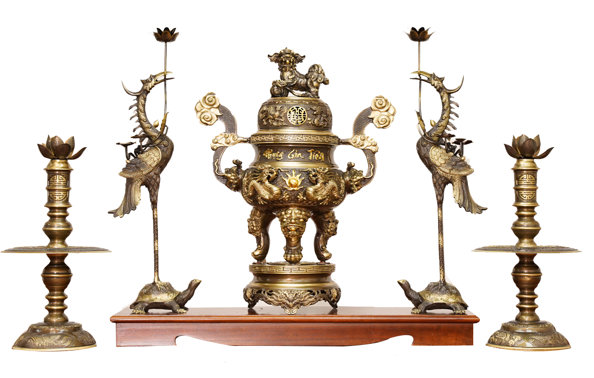 Bộ sản phẩm thường bao gồm một đỉnh thờ lớn và đôi chân nến hoặc đôi hạc, tạo thành một bộ tam sự hoặc ngũ sự trang trọng trên bàn thờ gia tiên.