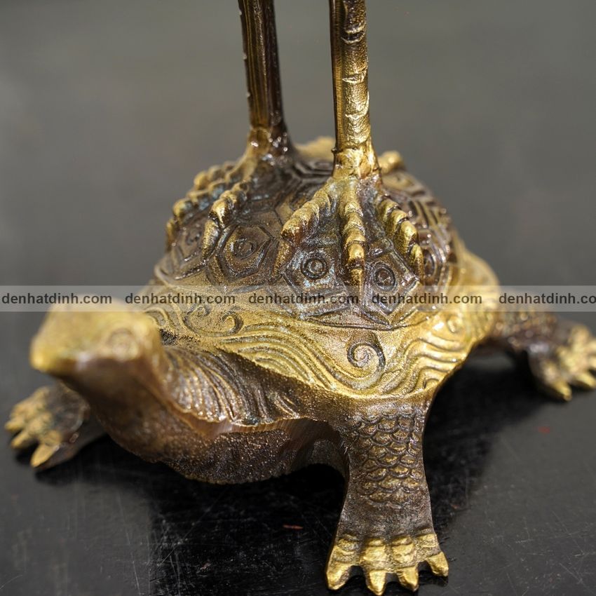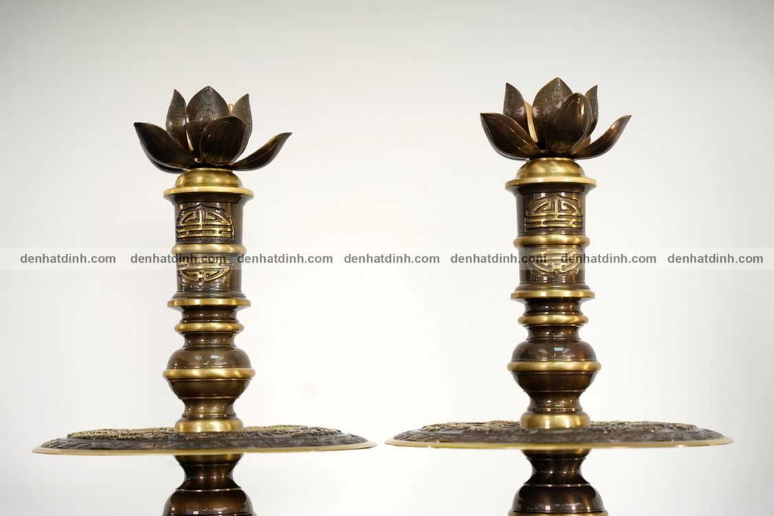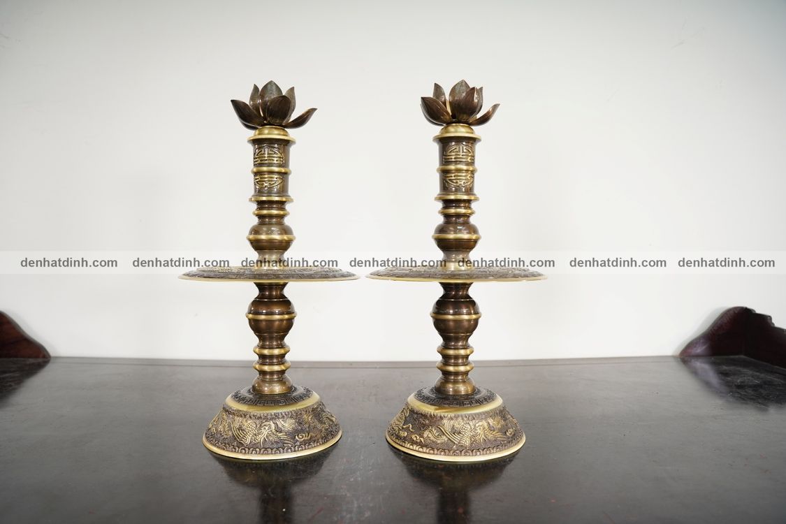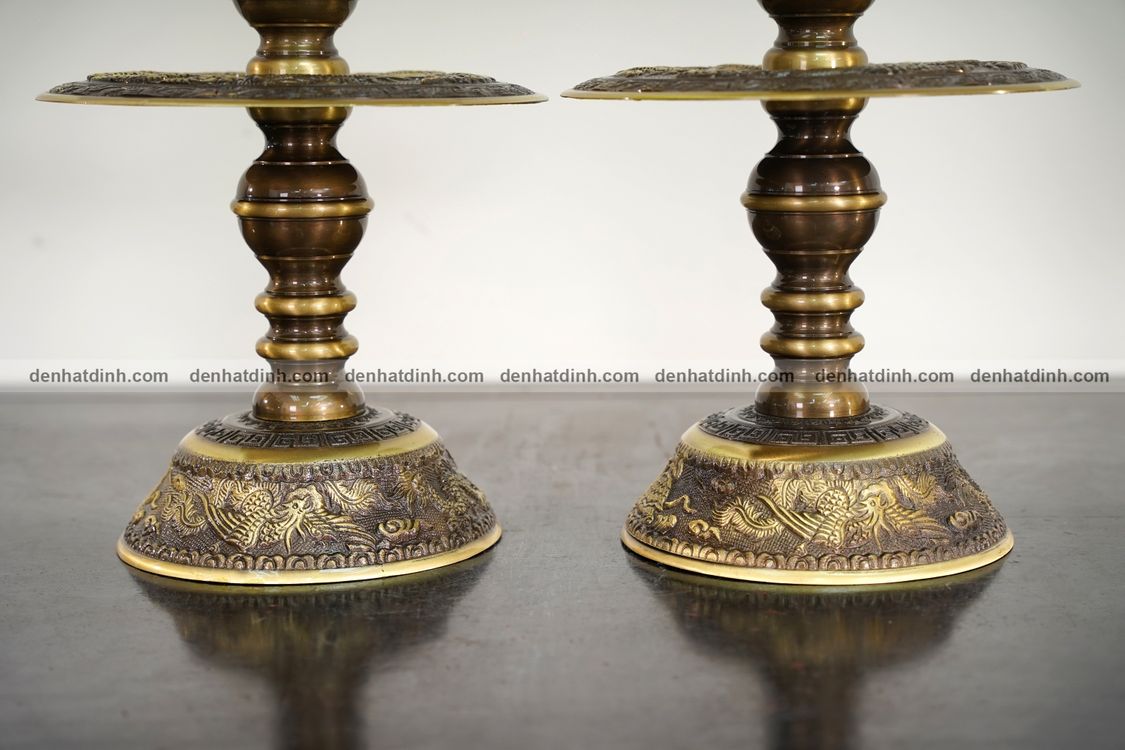 Hai bên đỉnh là đôi tai hình rồng cách điệu, uyển chuyển. Đôi chân nến được chạm khắc hoa văn tinh xảo, với phần đĩa rộng và đài sen cách điệu trên đỉnh. Cùng với đó là đôi hạc đồng đứng trên lưng rùa, miệng ngậm bông hoa sen, với các chi tiết lông vũ được chạm khắc công phu.