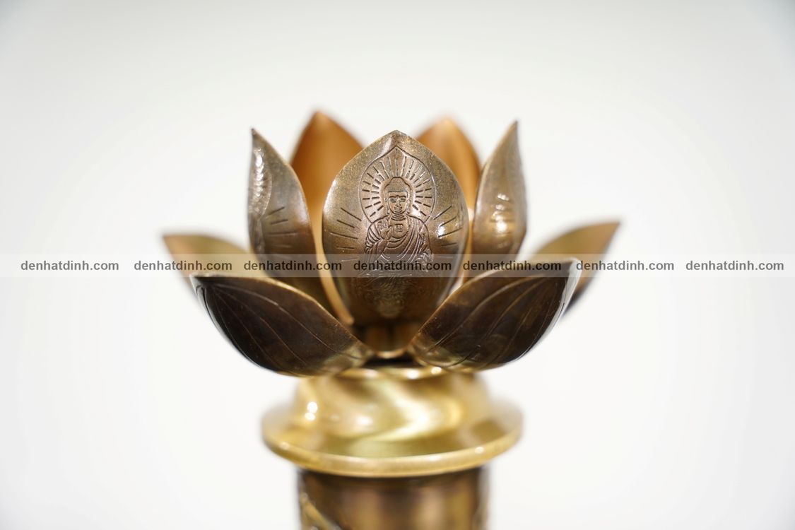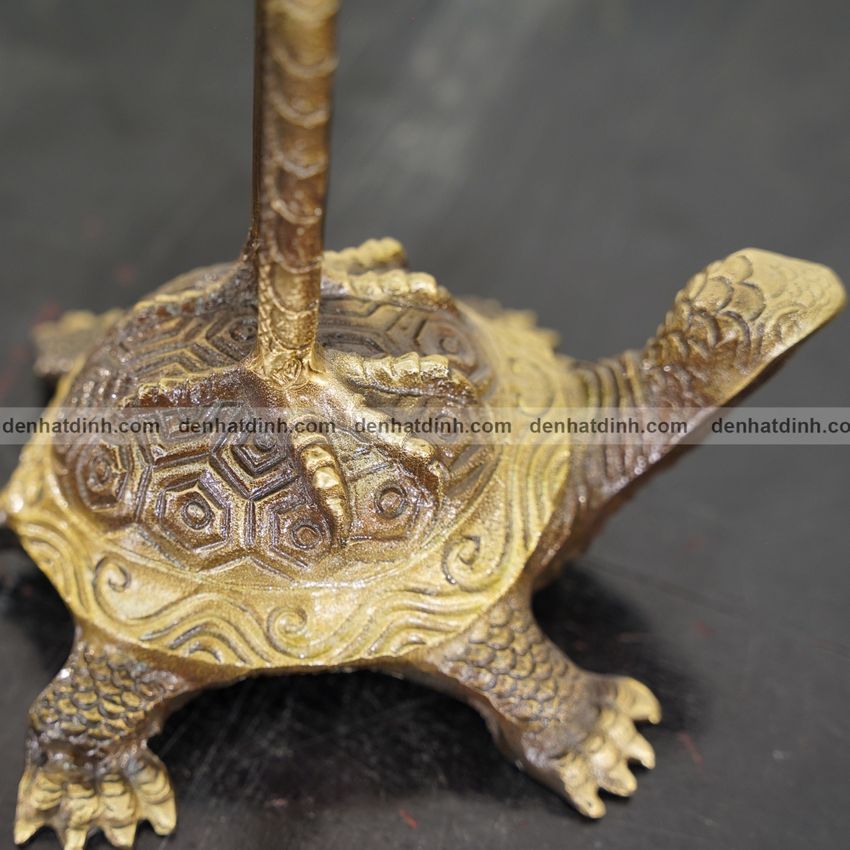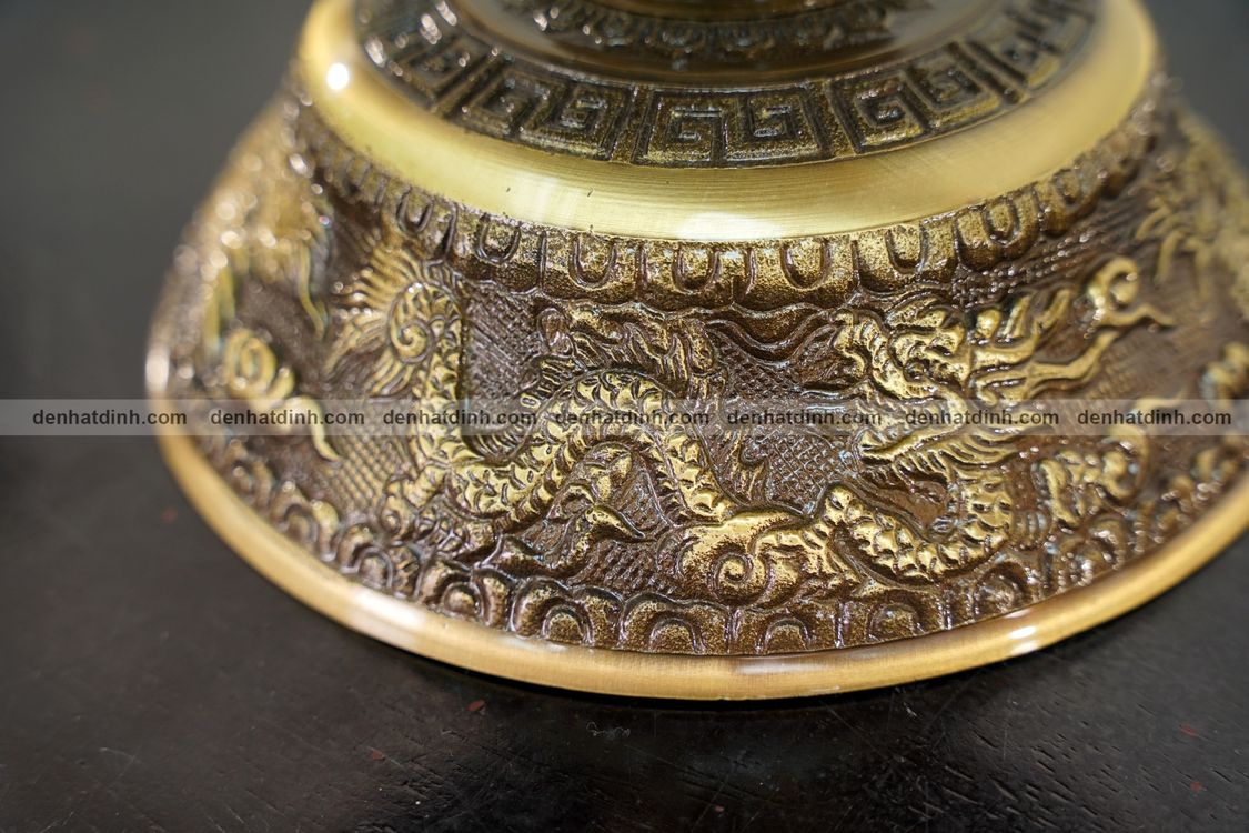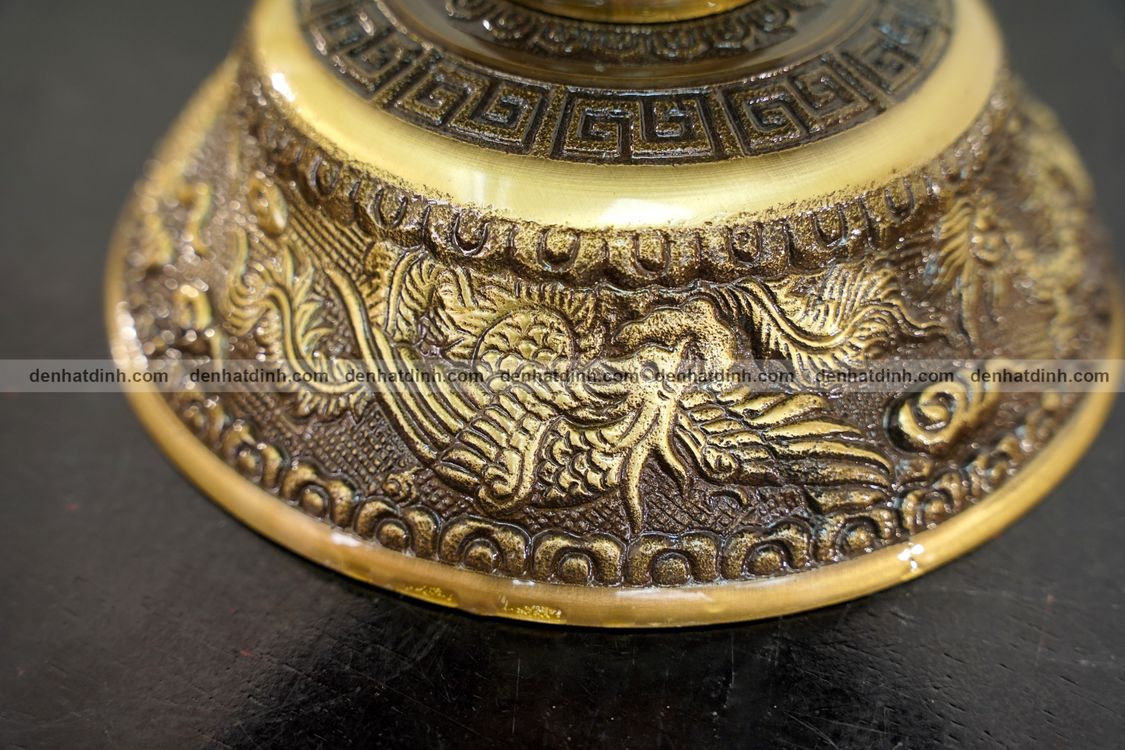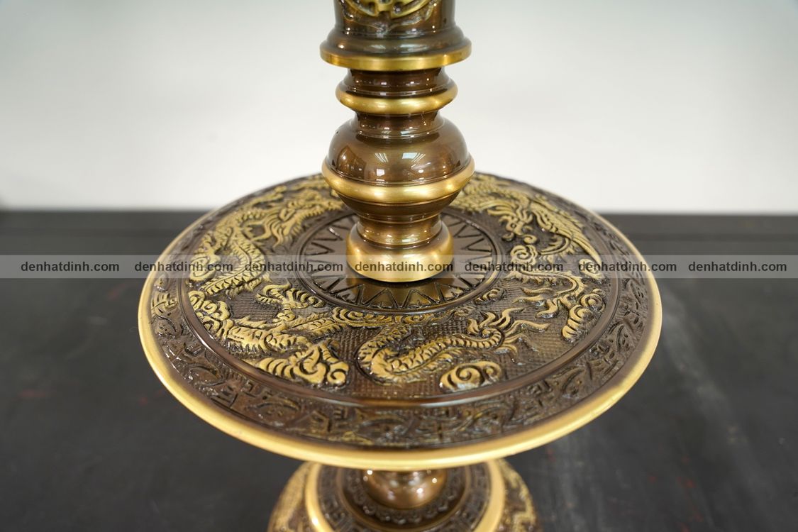Hai bên đỉnh là đôi tai hình rồng cách điệu, uyển chuyển. Đôi chân nến được chạm khắc hoa văn tinh xảo, với phần đĩa rộng và đài sen cách điệu trên đỉnh. Cùng với đó là đôi hạc đồng đứng trên lưng rùa, miệng ngậm bông hoa sen, với các chi tiết lông vũ được chạm khắc công phu.