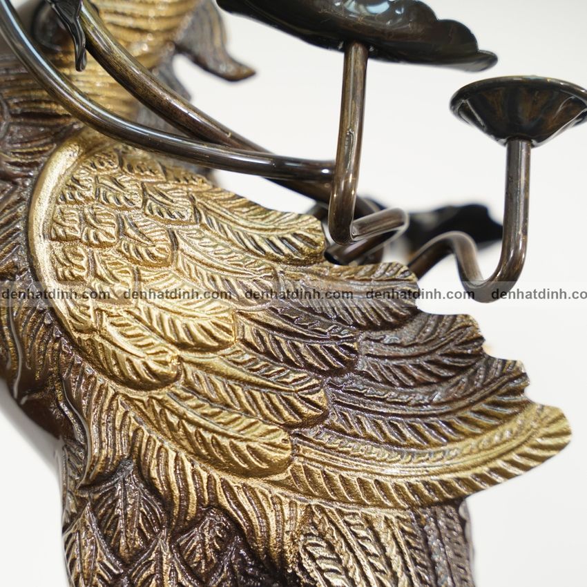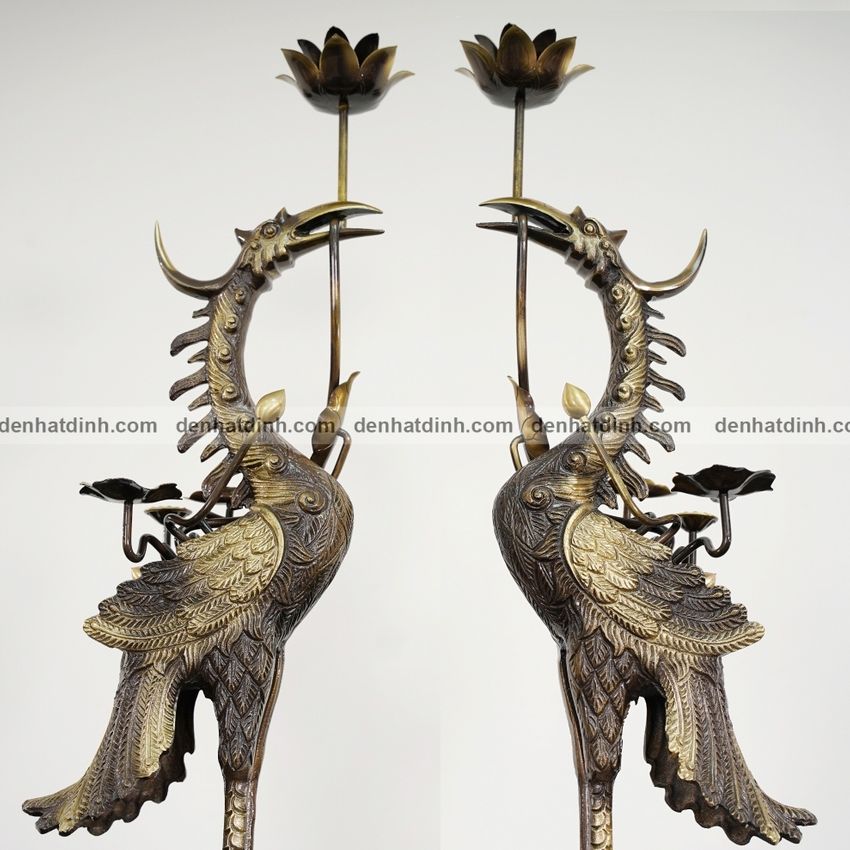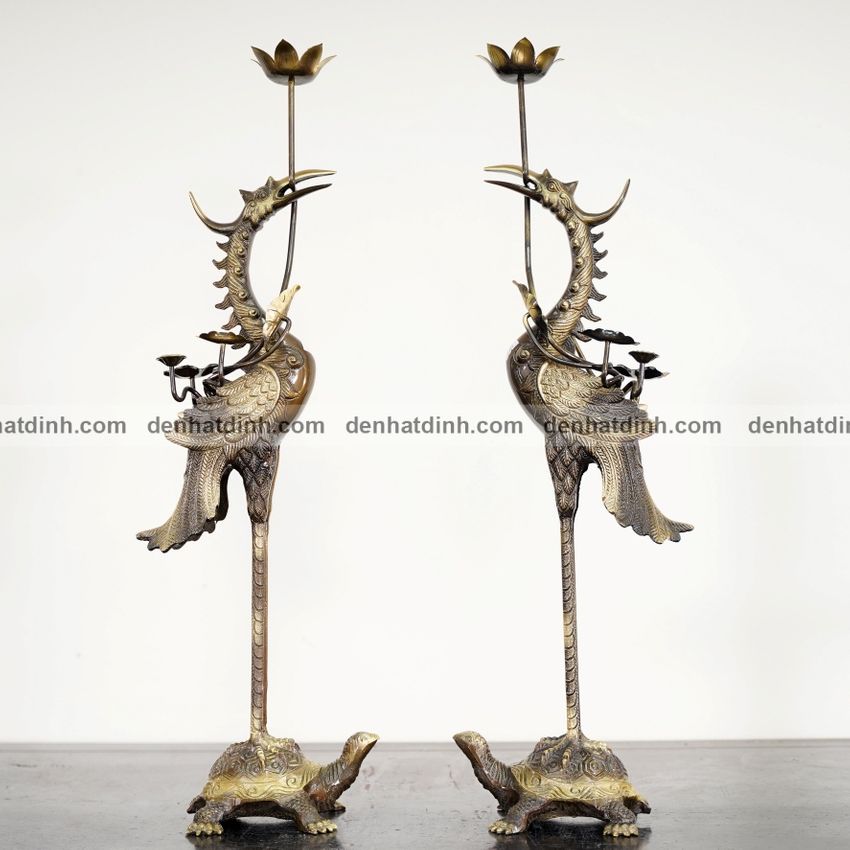 Hai bên là đôi chân nến được thiết kế với các tầng hoa văn tỉ mỉ, trên cùng là đài sen cách điệu để đặt nến. Cùng với đó là đôi hạc đồng đứng trên lưng rùa, miệng ngậm hoa sen, với phần thân hạc được chạm khắc lông vũ tinh tế.