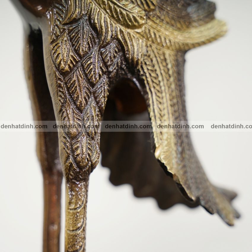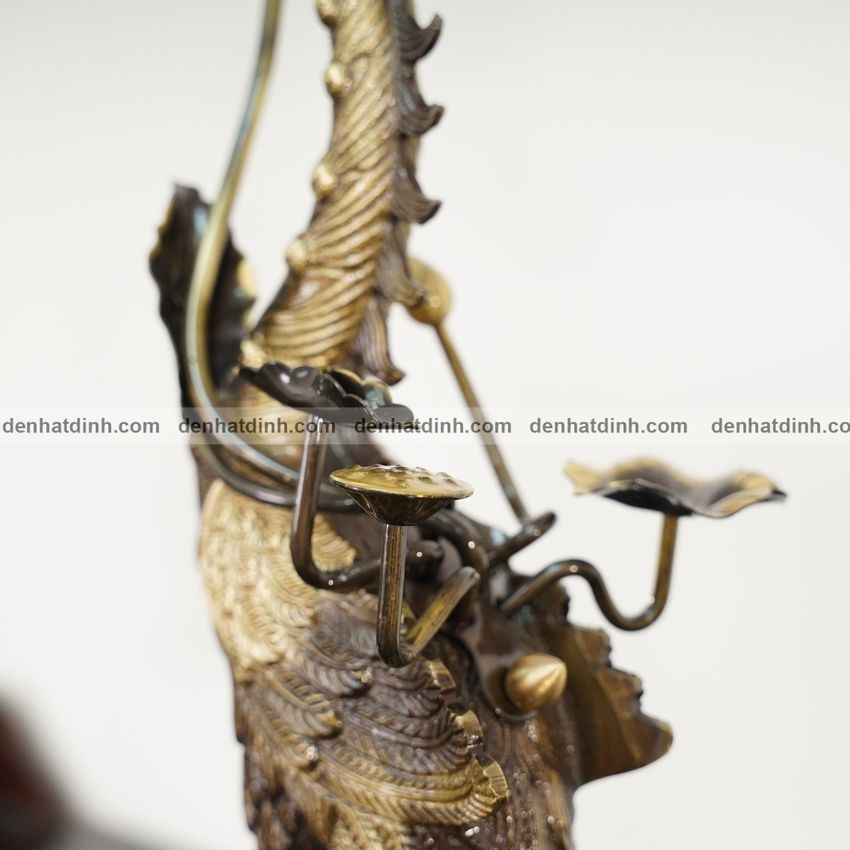 Hạc đồng: Hình ảnh hạc đứng trên lưng rùa, miệng ngậm hoa sen, tượng trưng cho sự trường thọ, thanh cao và may mắn. Phần thân hạc cũng được chạm khắc các chi tiết hoa văn tinh tế.