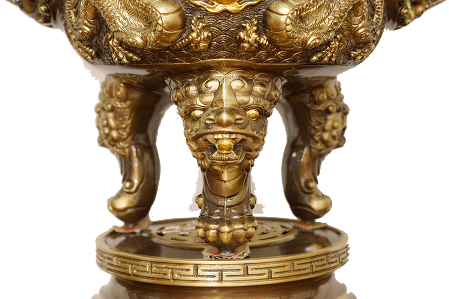 Bộ đỉnh đồng vàng được chạm khắc tinh xảo hoạ tiết Song long chầu nguyệt