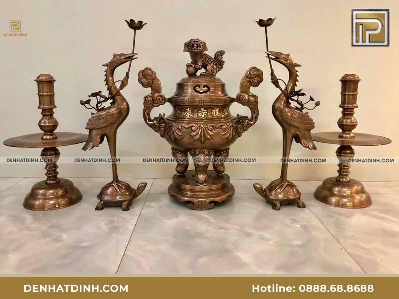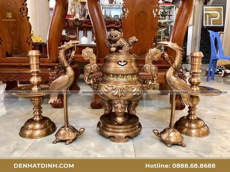 Đỉnh đồng đặt ở vị trí trung tâm, đôi hạc hoặc chân nến đặt đối xứng hai bên. Việc cách bày bộ đỉnh đồng trên bàn thờ đúng cách sẽ giúp không gian thờ cúng thêm trang nghiêm.