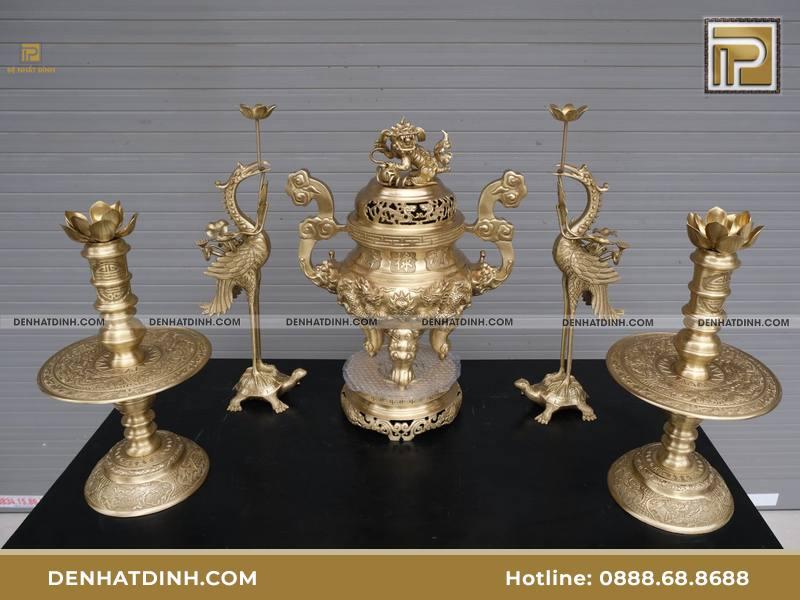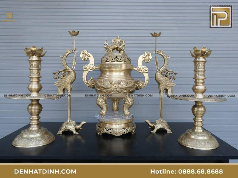 Nếu bàn thờ không đủ chỗ bày 5 món, gia chủ có thể chọn bộ tam sự bằng đồng. Bộ này gồm đỉnh đồng kết hợp đôi hạc hoặc đôi nến.