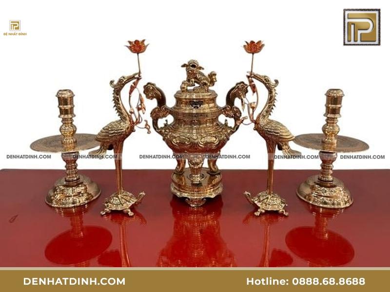 Mức giá phụ thuộc vào chất liệu đồng và kỹ thuật chế tác. Dưới đây là bảng giá tham khảo cho bộ ngũ sự gồm 1 đỉnh, 2 hạc đồng, 2 chân nến đồng.