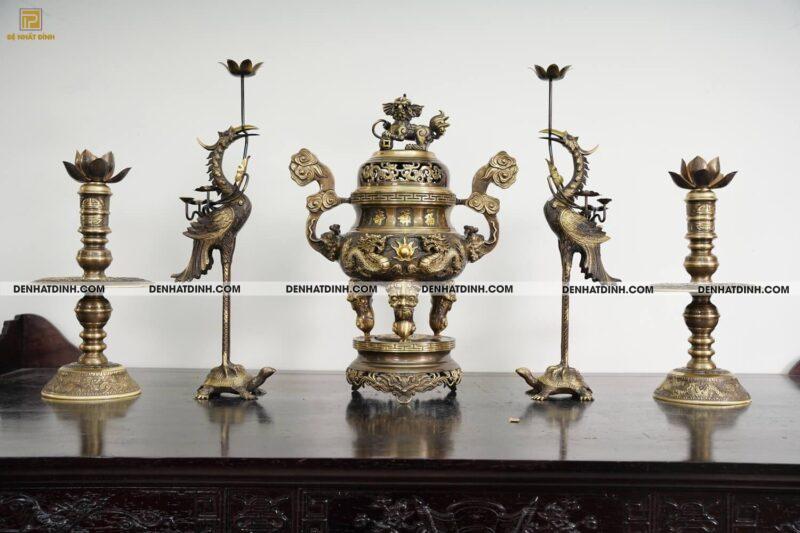 Màu hun cổ trầm ấm đặc biệt phù hợp với nền gỗ phòng thờ, giúp bộ đỉnh nổi bật nhưng không quá chói, giữ được vẻ cổ kính, truyền thống.
