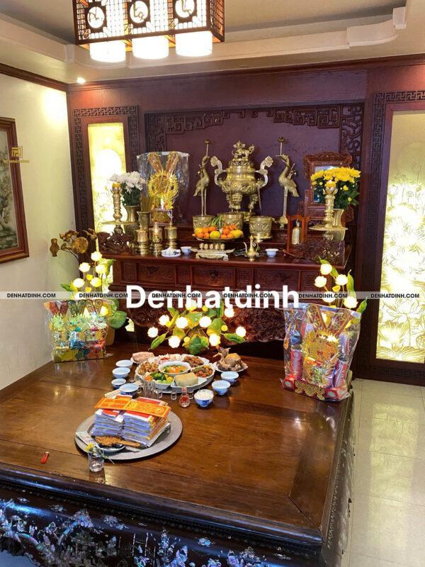 Bộ đỉnh 3 chữ Hán được đặt ở vị trí trung tâm bàn thờ, phía trước là bộ đồ thờ sứ xanh truyền thống, hai bên là đôi hạc đứng trên lưng rùa – tạo thế cân đối, vững chãi.