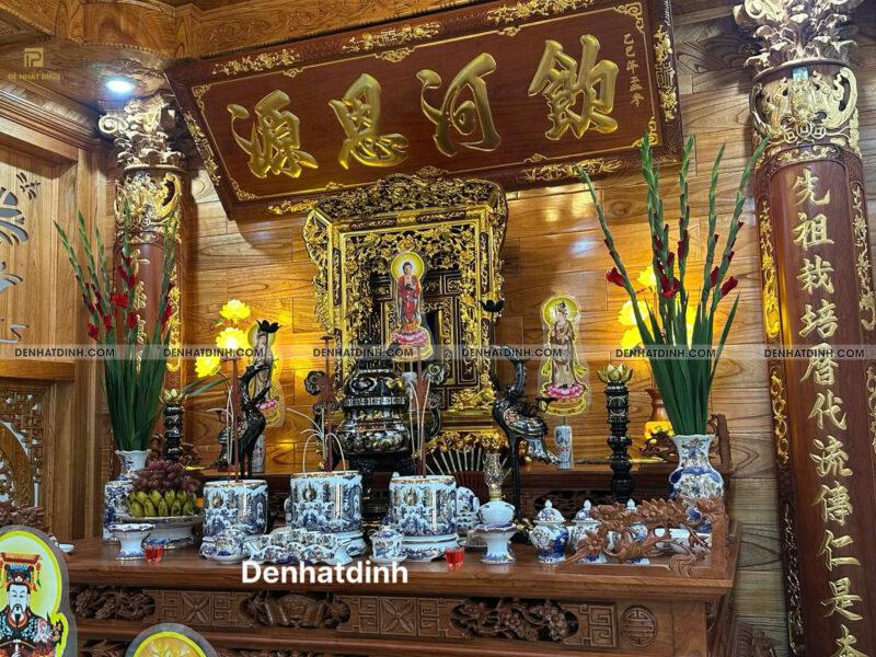 Sự kết hợp giữa bộ đỉnh đồng Pháp Lam và nền gỗ phòng thờ tạo nên một tổng thể hài hòa, cân đối và vô cùng trang trọng.