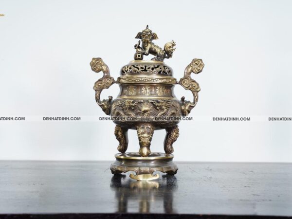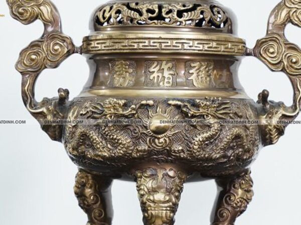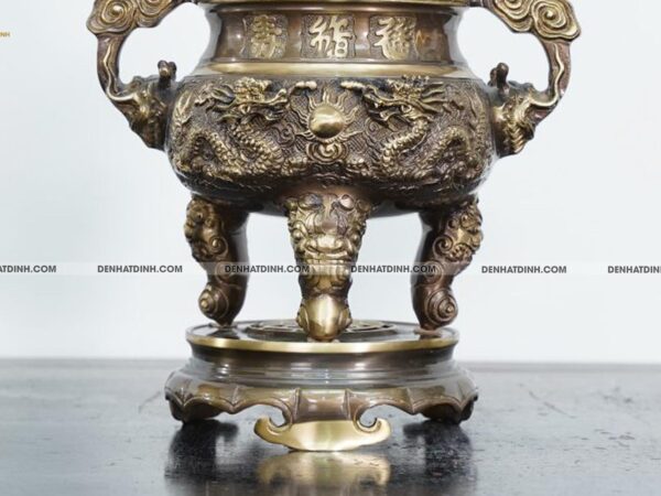 Bộ 3 chân quỳ tam lân trấn giữ trọng lượng cả bộ đỉnh nên được đúc liền nguyên khối. Với thiết kế này, gia chủ yên tâm thờ phụng mà không lo độ nóng của hương hỏa trên ban có thể làm lung lay các mối hàn hay ốc vít như những loại hàng đồng Đài Loan rẻ tiền hay gặp phải.