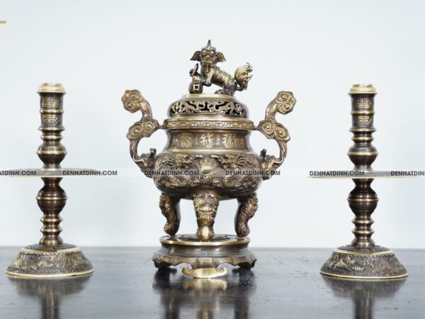 Hãy là người đầu tiên nhận xét “Bộ đỉnh đồng tam sự nến song long 40 hoa văn CN”
