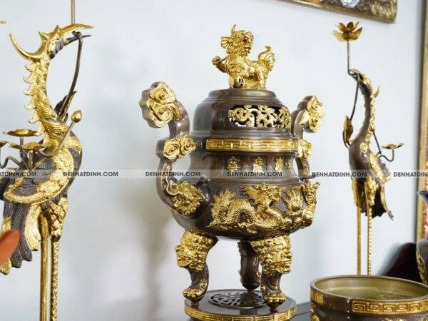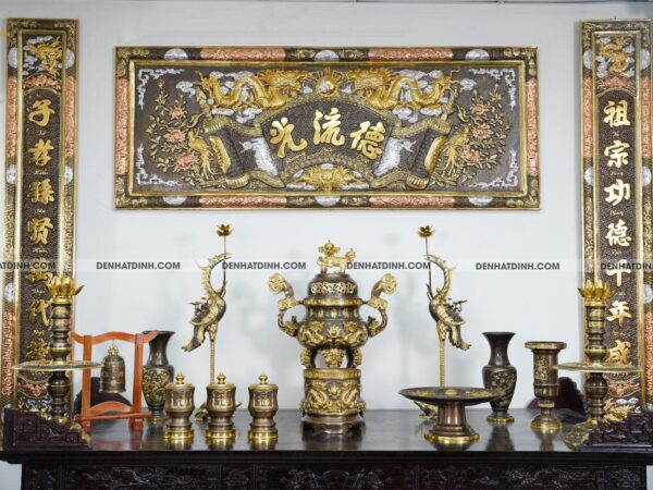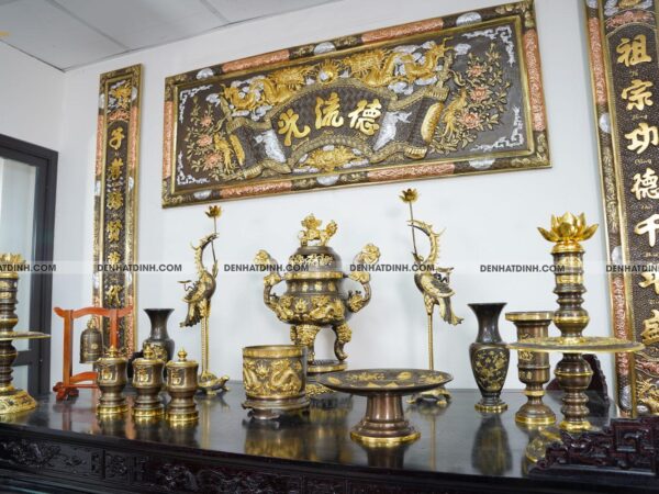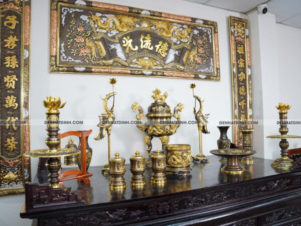 Bộ đỉnh đồng ngũ sự dát vàng điểm Song long đỉnh cao 66 là tác phẩm thờ cúng được chế tác công phu. Đỉnh đồng cao 66cm, tạo hình song long chầu nguyệt, biểu tượng cho quyền uy và linh thiêng. Đôi hạc đồng cao 72cm, đứng trên lưng rùa, thể hiện sự trường thọ và hòa hợp âm dương. Đôi chân nến cao 51cm, được chạm khắc hoa văn tỉ mỉ, mang vẻ đẹp cổ kính và trang nghiêm. Bát hương đồng đường kính 20cm, được đặt ở vị trí trung tâm, là nơi kết nối tâm linh giữa trần thế và cõi thiêng. Đôi lọ hoa cao 30cm, có màu sắc đồng mộc hài hòa, giúp không gian ban thờ thêm sinh động, thanh khiết. Bộ đài thờ gồm ba chiếc cao 10cm, được dùng để đựng rượu thờ, nước sạch, mang ý nghĩa thanh tịnh và hiếu kính. Mâm hoa quả đường kính 30cm, đặt phía trước ban thờ, được dùng để bày trái cây dâng cúng tổ tiên. Ống hương cao 25cm, được đặt bên cạnh bát hương, dùng để cắm hương sạch, giữ ban thờ luôn gọn gàng, trang trọng. Chuông treo cao 17cm, đi kèm với giá gỗ đỏ, âm thanh vang vọng, dùng khi tụng kinh hoặc cầu an. Bộ hoành phi câu đối dài 1m76, được khảm tam khí tinh xảo, gồm đồng đỏ, đồng vàng và bạc trắng, nổi bật chữ Hán cổ mang hàm ý sâu sắc. Tất cả sản phẩm đều được làm từ chất liệu đồng Cattut cao cấp, được dát vàng thủ công ở các chi tiết quan trọng như rồng, phượng, hoa văn chữ Hán. Các đường nét trên thân đỉnh, hạc và hoành phi đều được chạm tay công phu, tỉ mỉ, tạo nên tổng thể hài hòa và sang trọng. Đây là sản phẩm được sản xuất bởi Đệ Nhất Đỉnh, một thương hiệu nổi tiếng với tay nghề đúc thủ công truyền thống lâu đời. Sự kết hợp giữa kỹ thuật cổ điển và nét tinh hoa hiện đại tạo nên một bộ đồ thờ đẳng cấp, bền đẹp theo thời gian. Bề mặt sản phẩm được xử lý nhẵn mịn, chống oxi hóa, giữ được vẻ sáng bóng và bền màu lâu dài. Các họa tiết long phụng, hoa sen, sóng nước được bố trí cân đối, khắc họa rõ nét sự linh thiêng và vẻ đẹp nghệ thuật. Bộ sản phẩm mang phong cách truyền thống nhưng vẫn phù hợp với nhiều không gian thờ cúng hiện đại. Kích thước từng món đồ được tính toán tỷ lệ hợp lý, tạo sự cân đối trên bàn thờ gia tiên. Màu sắc chủ đạo là đồng mộc phối điểm vàng, tạo cảm giác trầm mặc, uy nghiêm nhưng vẫn nổi bật và sang trọng. Đỉnh đồng với chân rồng ba chân, miệng tròn, nắp khắc rồng bay trên mây, là điểm nhấn trung tâm của bộ thờ. Hạc đứng thẳng, mỏ ngậm hoa sen, dáng uyển chuyển, thân khắc vảy cá, thể hiện sự sống trường tồn. Chân nến khắc chữ Thọ, phối hoa văn cuốn thư, là biểu tượng cầu phúc và an lành. Lọ hoa, mâm quả, ống hương đều có thiết kế đồng bộ, thống nhất về họa tiết và màu sắc. Từng chi tiết được nghệ nhân xử lý thủ công tỉ mỉ, đảm bảo tính thẩm mỹ và giá trị tâm linh cao. Bộ sản phẩm này thường được chọn cho những ban thờ lớn, tại từ đường, nhà thờ họ hoặc ban thờ gia tiên rộng rãi.