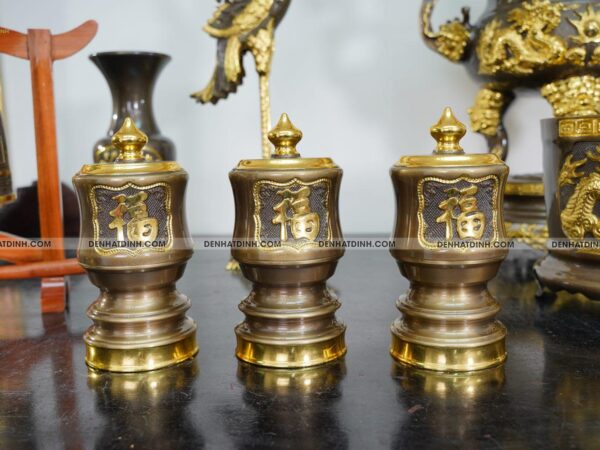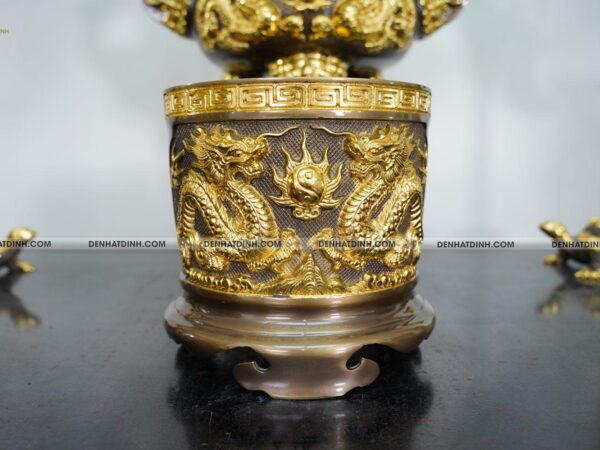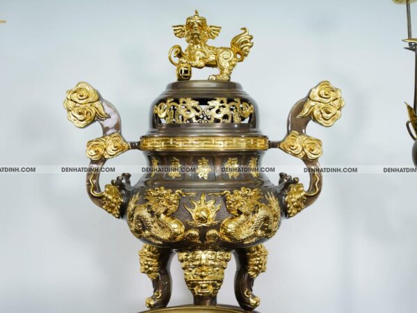 - Đỉnh đồng: Là trung tâm của bộ ngũ sự, thường được đặt ở vị trí cao nhất trên bàn thờ. Đỉnh đồng có thể được thiết kế với nhiều kiểu dáng khác nhau, nhưng phổ biến nhất là hình lư tròn hoặc hình vuông, với các họa tiết hoa văn chạm khắc tinh xảo.