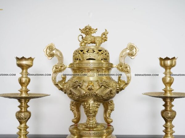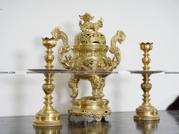 Đỉnh đồng là vật phẩm trung tâm trong bộ tam sự, thường được đặt chính giữa bàn thờ. Phần nắp đỉnh được chạm khắc hình rồng phun mây và cuốn thư, tượng trưng cho sự kết nối giữa thế giới tâm linh và con người. Rồng trong văn hóa Á Đông là biểu tượng của sức mạnh, quyền uy và sự thịnh vượng.