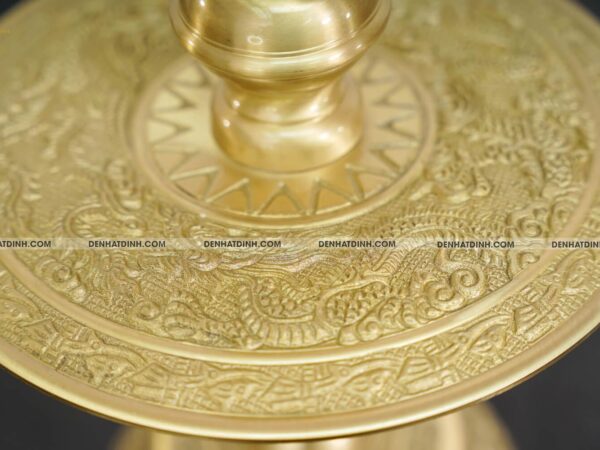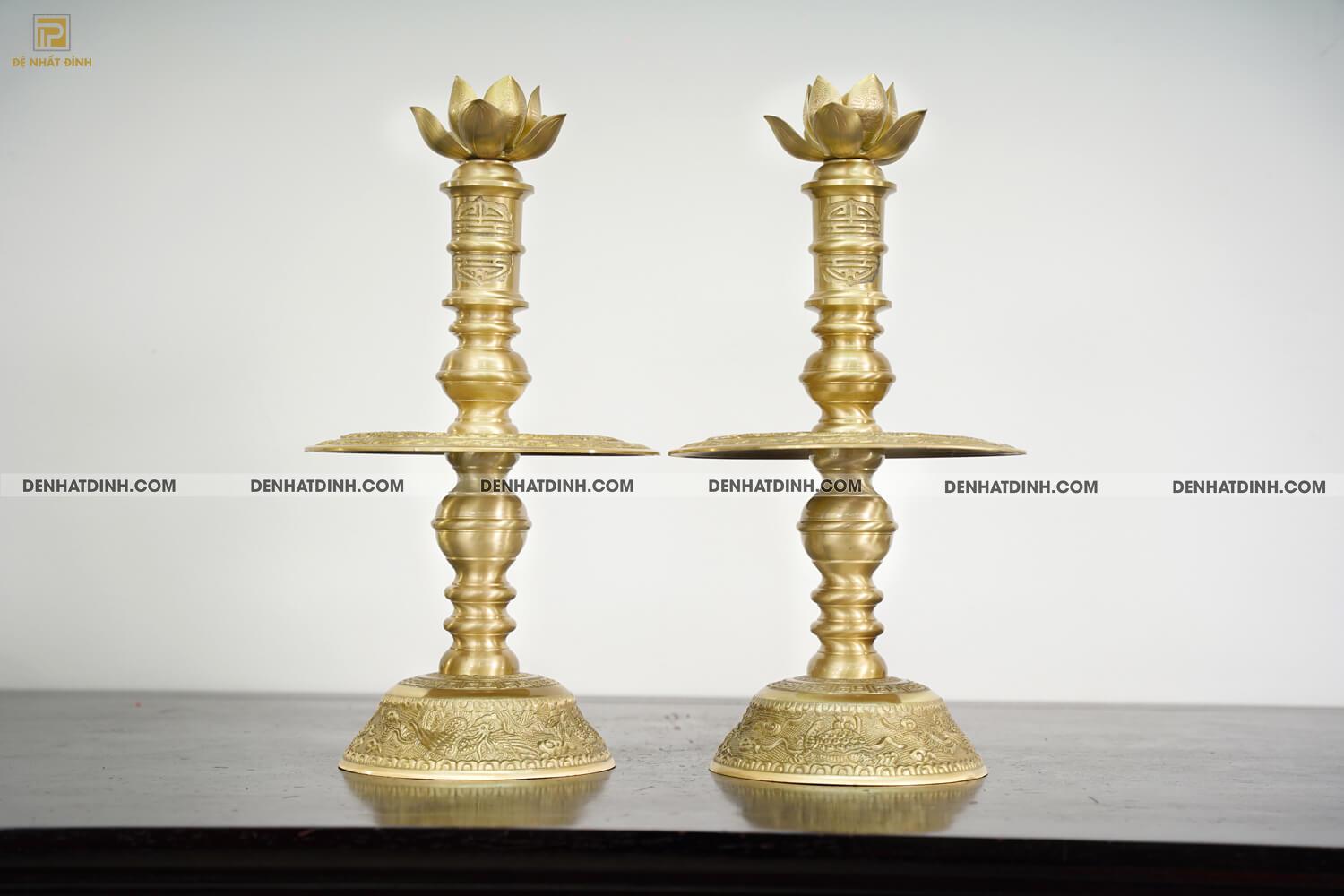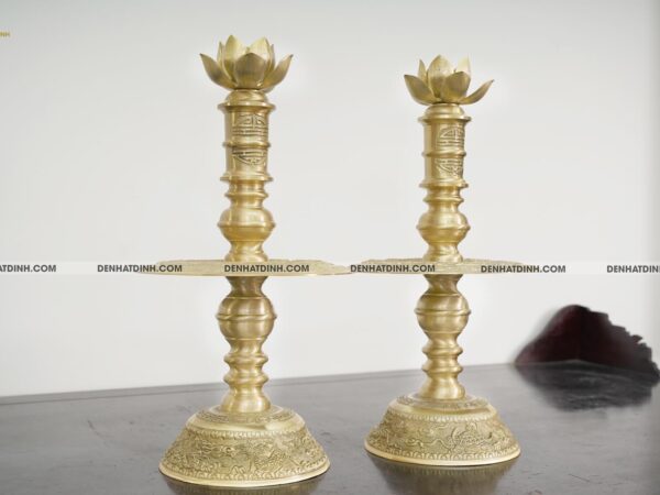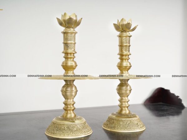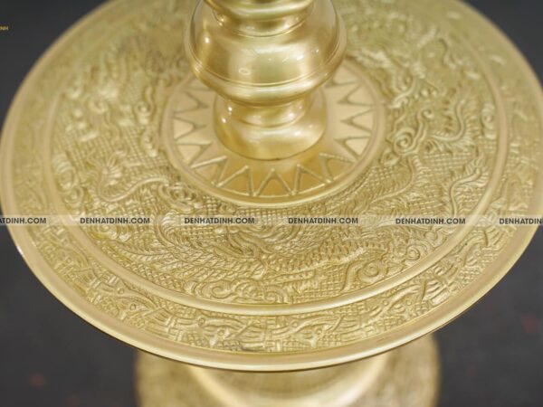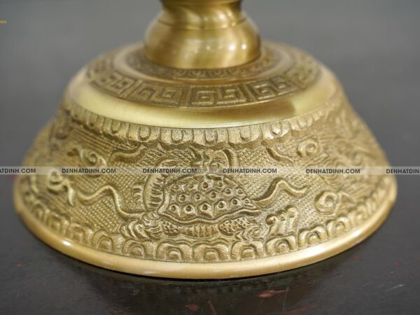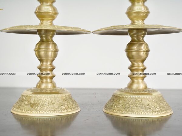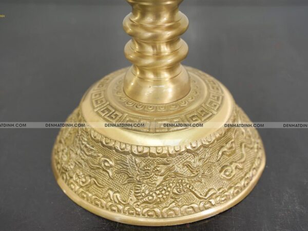 Phần đế nến vững chắc, chạm khắc họa tiết sắc sảo, thể hiện kỹ thuật đúc đồng lâu đời.
