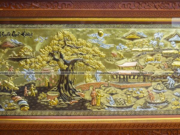 Tranh đồng “Cội nguồn quê hương” được chế tác tinh xảo bằng đồng nguyên tấm, nổi bật với các gam màu vàng, đỏ, ánh bạc, mang vẻ đẹp truyền thống sang trọng.