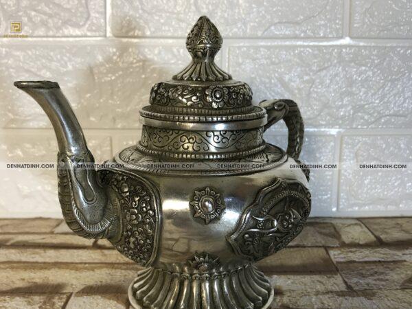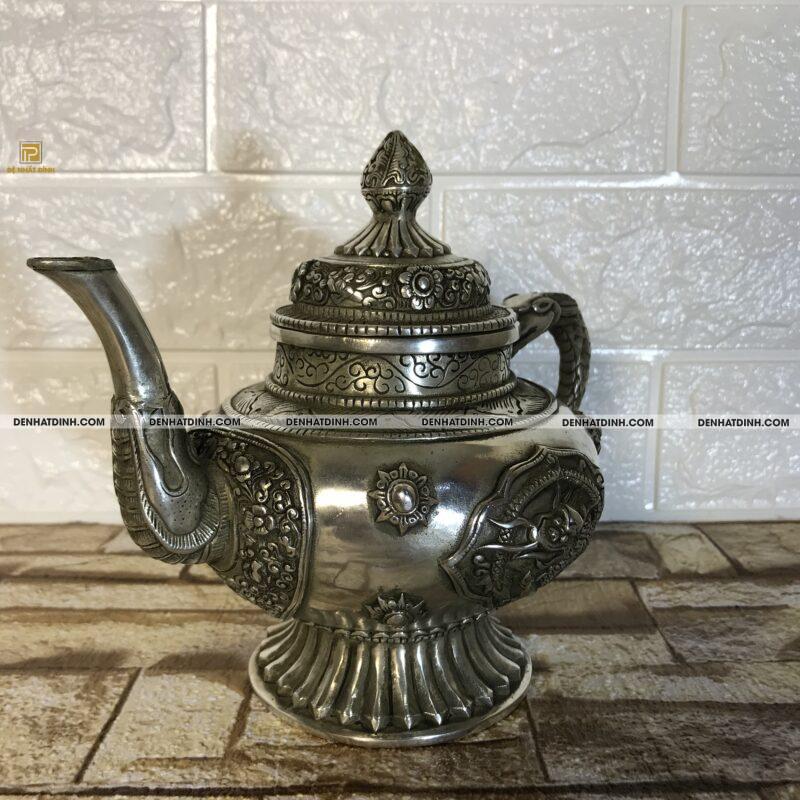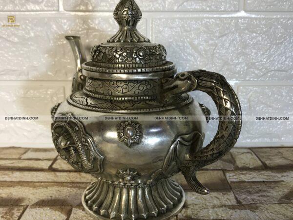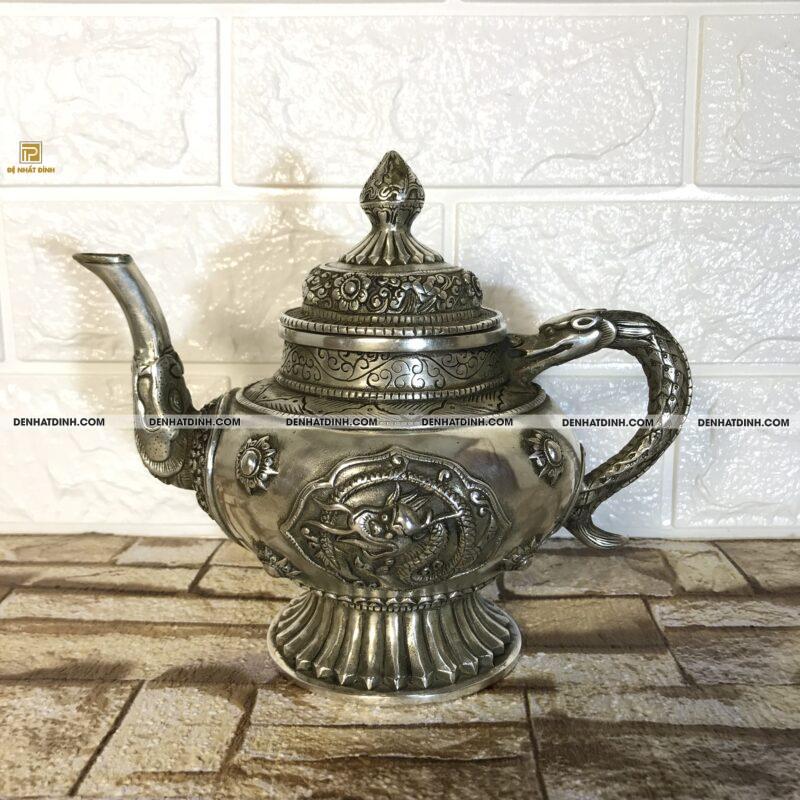 Ấm trà cổ bằng đồng chạm rồng là một tác phẩm thủ công mang đậm dấu ấn văn hóa Á Đông. Sản phẩm được chế tác hoàn toàn bằng đồng, phủ lớp màu giả cổ ánh bạc xám, tạo nên vẻ đẹp trầm mặc, cổ kính và đầy giá trị sưu tầm.