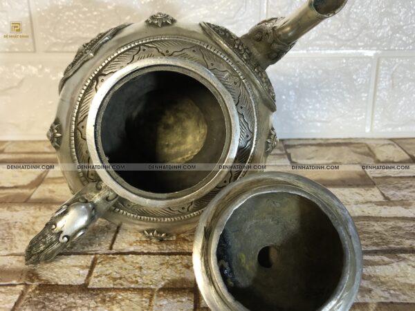 Trải qua thời gian, nước đồng lên màu tự nhiên, ánh bạc pha trầm khiến từng chi tiết chạm khắc càng nổi bật hơn. Hình tượng rồng – linh vật tối cao trong văn hóa phương Đông – được thể hiện tinh xảo trên thân, vòi và quai ấm, vừa mang ý nghĩa phong thủy sâu sắc, vừa tôn lên vẻ uy nghi, sang trọng của món cổ vật.