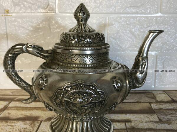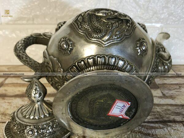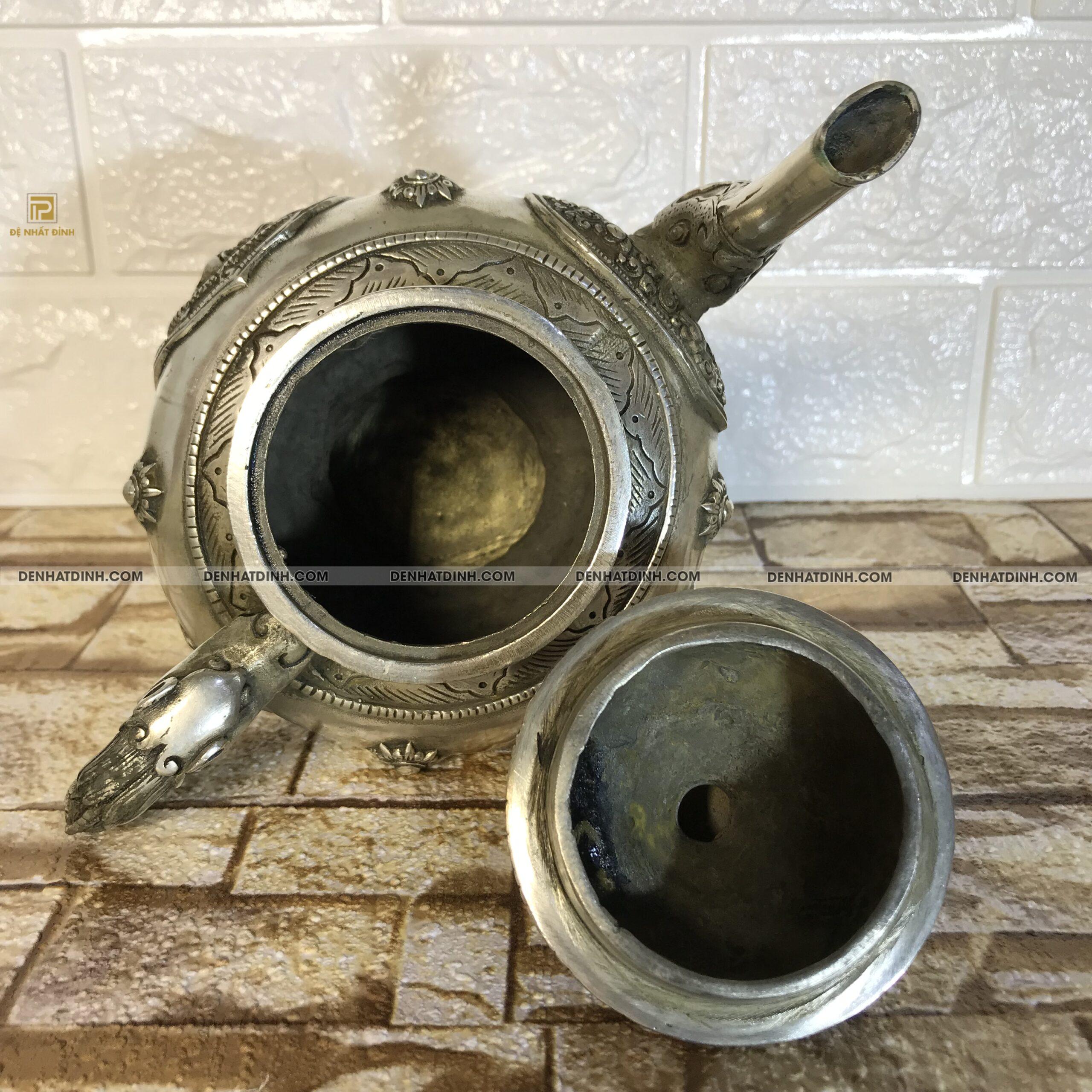 Trải qua thời gian, nước đồng lên màu tự nhiên, ánh bạc pha trầm khiến từng chi tiết chạm khắc càng nổi bật hơn. Hình tượng rồng – linh vật tối cao trong văn hóa phương Đông – được thể hiện tinh xảo trên thân, vòi và quai ấm, vừa mang ý nghĩa phong thủy sâu sắc, vừa tôn lên vẻ uy nghi, sang trọng của món cổ vật.