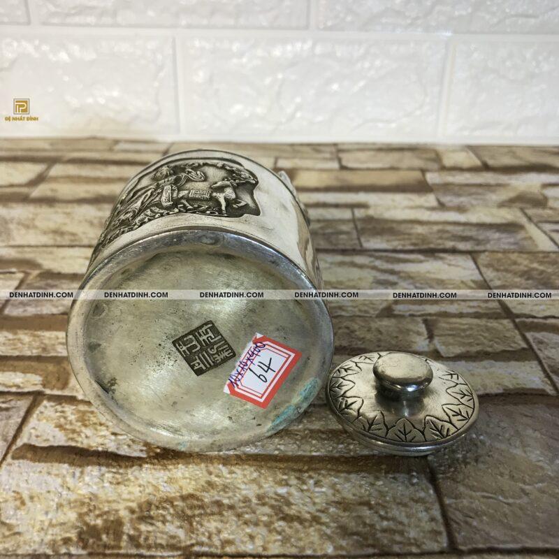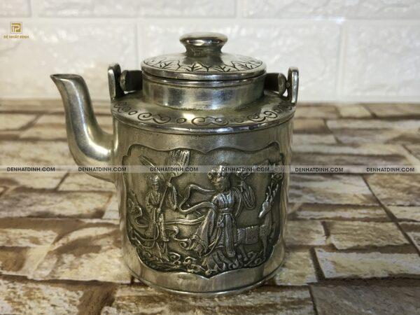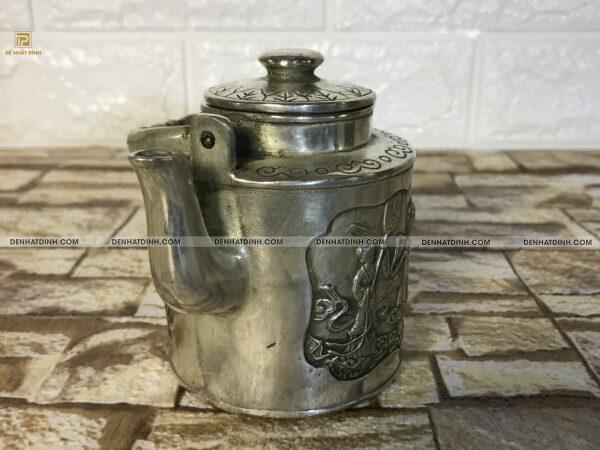 Chiếc ấm đồng không chỉ mang giá trị thẩm mỹ cao mà còn là minh chứng cho tay nghề chạm khắc cổ truyền, với từng đường nét nổi khối tinh tế, bố cục hài hòa, thể hiện sự hòa quyện giữa nghệ thuật và triết lý sống.