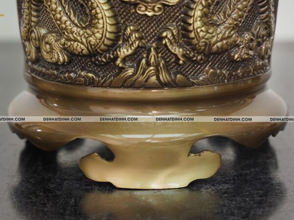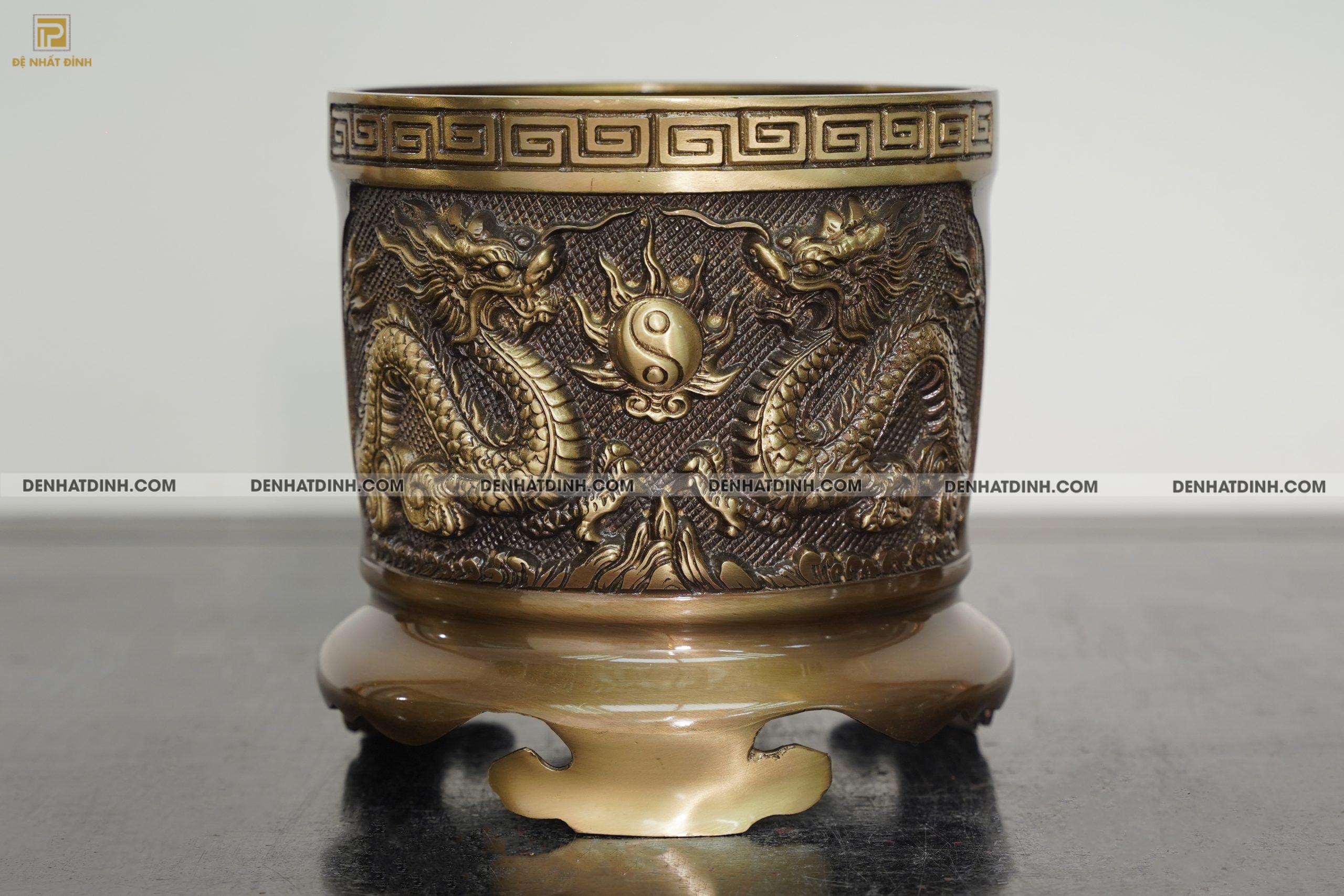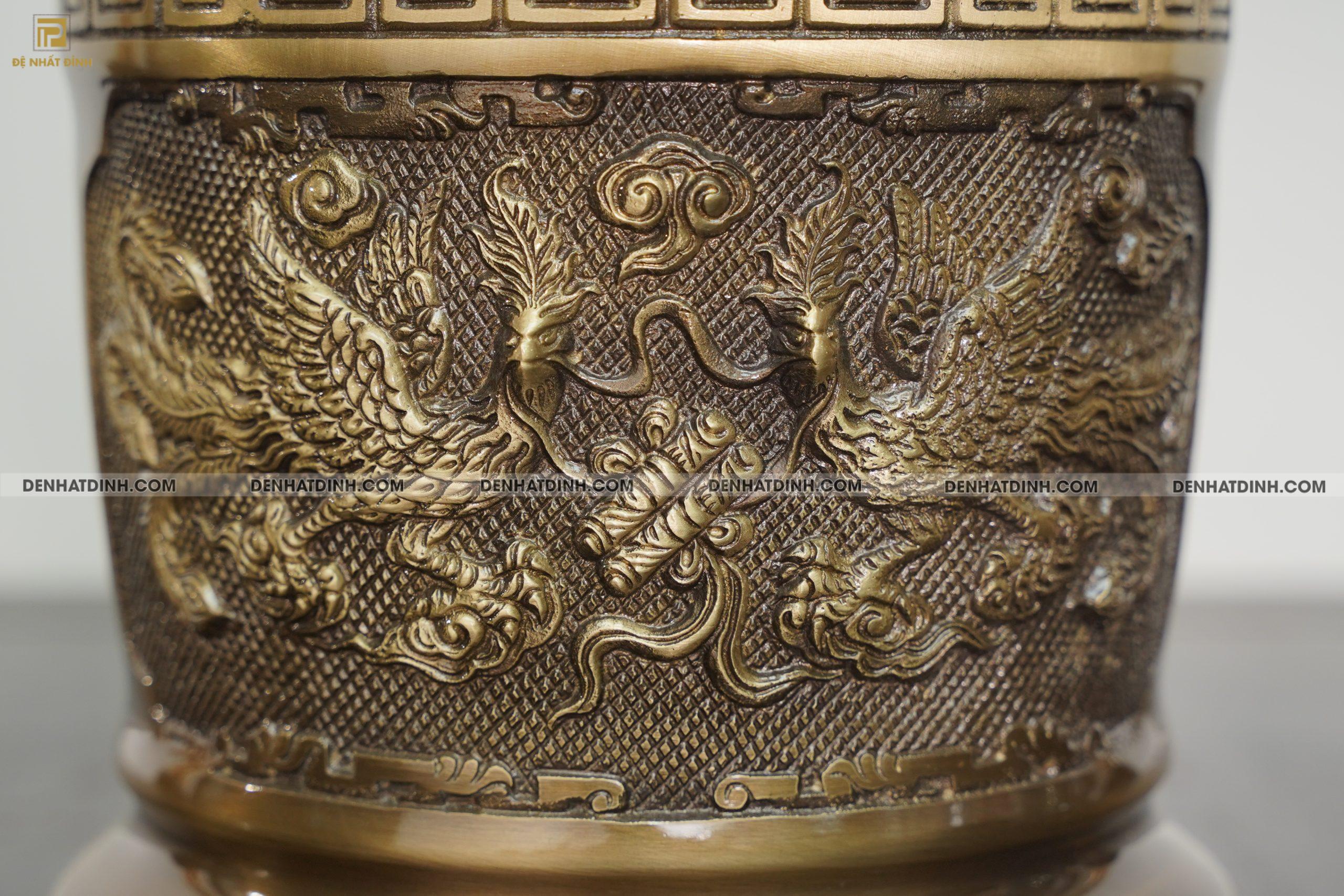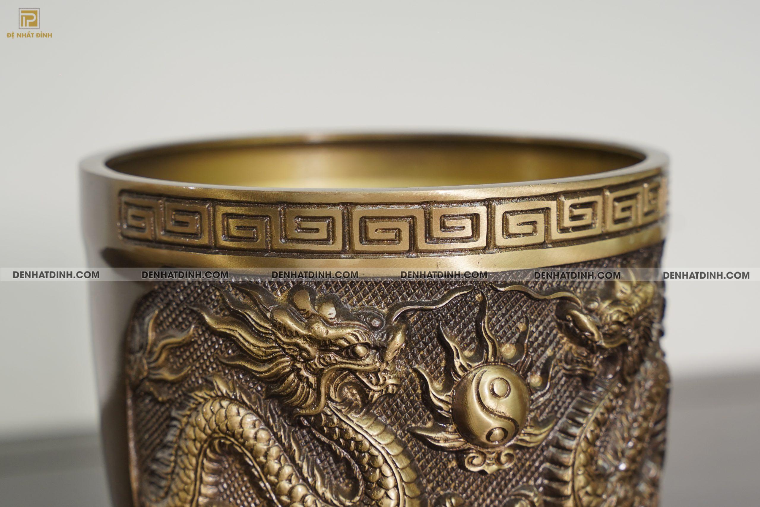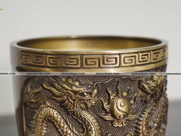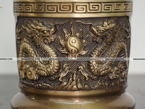 Các chi tiết chạm khắc như họa tiết rồng chầu thái cực được làm nổi bật trên nền đồng hun cổ, vừa đẹp mắt vừa mang giá trị phong thủy mạnh mẽ.