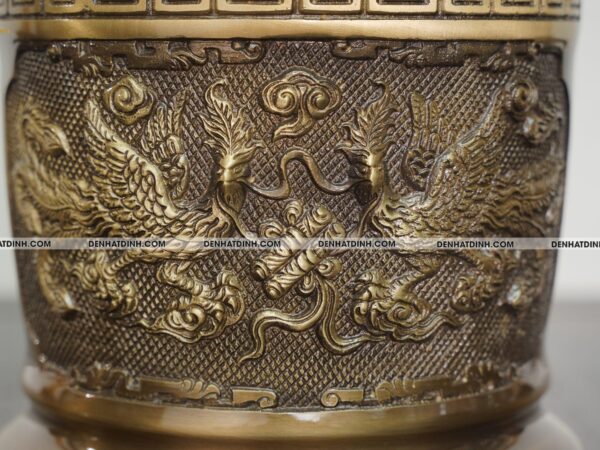 Các chi tiết chạm khắc như họa tiết rồng chầu thái cực được làm nổi bật trên nền đồng hun cổ, vừa đẹp mắt vừa mang giá trị phong thủy mạnh mẽ.