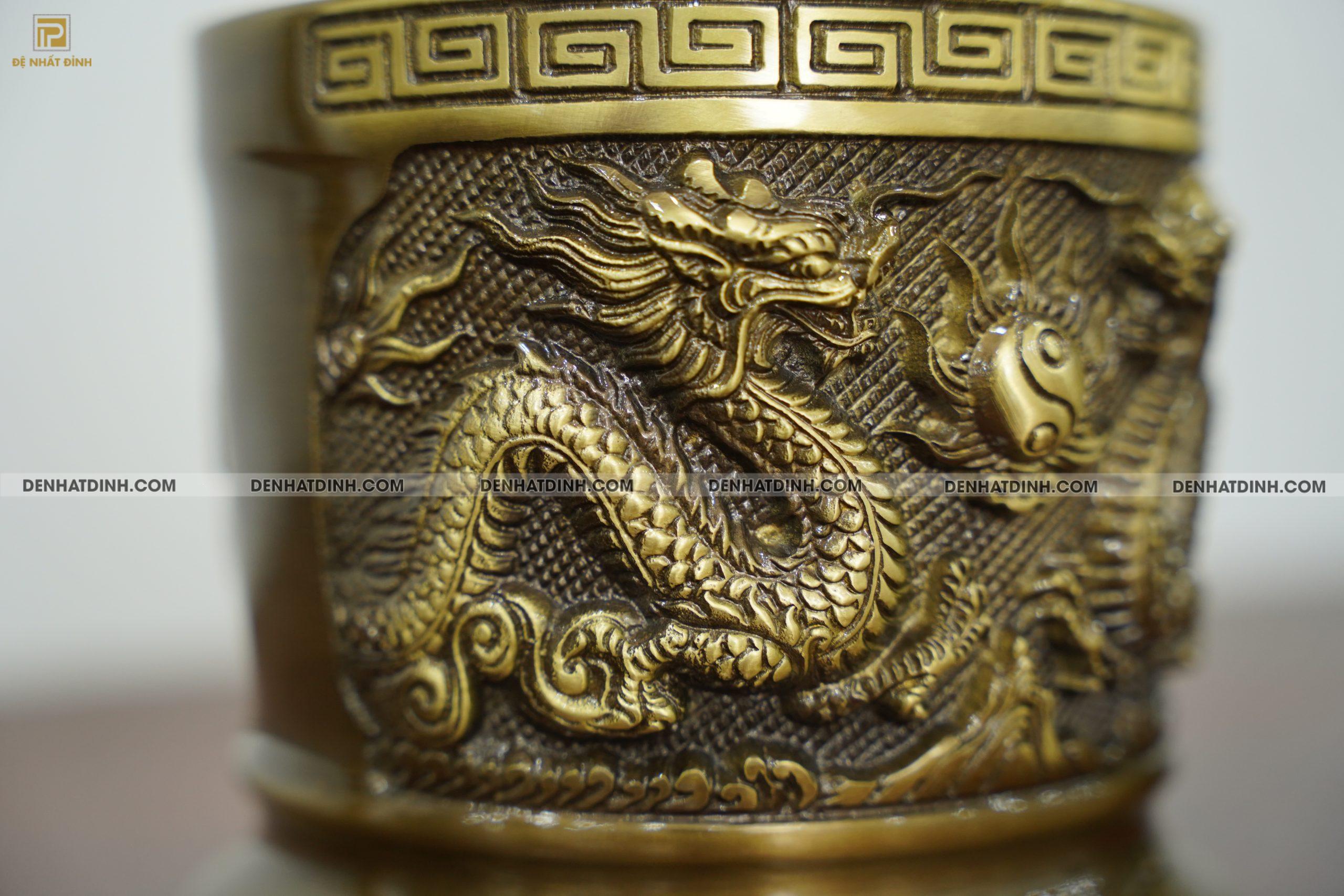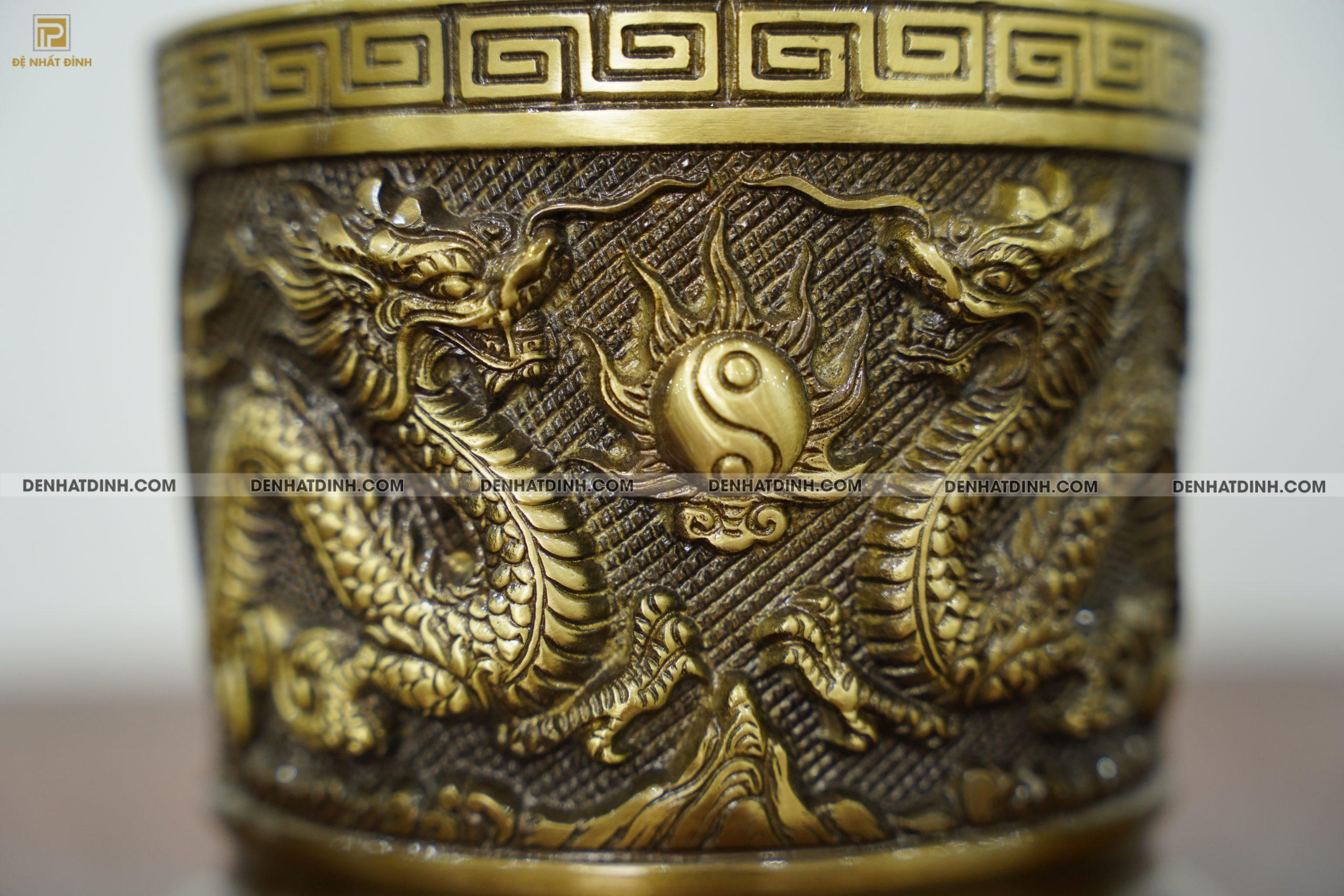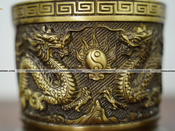 Hoa văn: Mặt trước đúc nổi hình ảnh song long chầu mặt nguyệt – biểu tượng phong thủy cao quý, mạnh mẽ và linh thiêng.