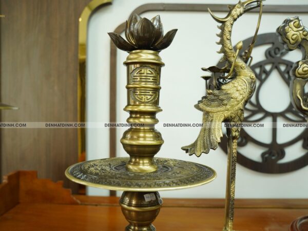 – Đôi chân nến: Mẫu chân nến được đúc dạng ống tròn trơn, thắt eo nhiều chỗ, phía trên đỉnh nến có đặt một bông sen bằng đồng. Thân nến và lá nến được đúc chữ Phúc và đĩa nến được đúc nổi Long Ly Quy Phụng chi tiết tỉ mỉ