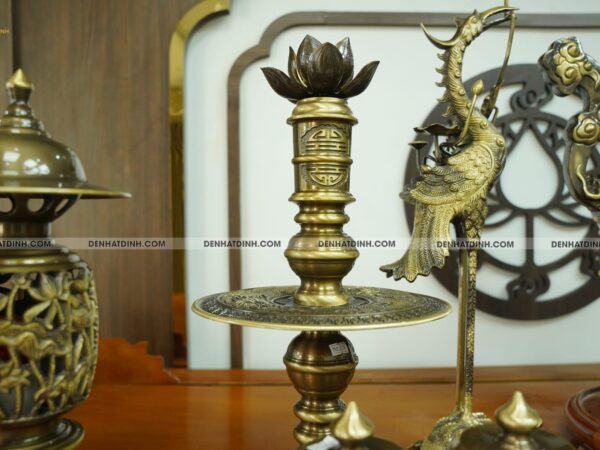 – Đôi chân nến: Mẫu chân nến được đúc dạng ống tròn trơn, thắt eo nhiều chỗ, phía trên đỉnh nến có đặt một bông sen bằng đồng. Thân nến và lá nến được đúc chữ Phúc và đĩa nến được đúc nổi Long Ly Quy Phụng và Tùng Cúc Trúc Mai đăng đối với nhau