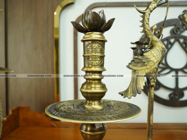 – Đôi chân nến: Mẫu chân nến được đúc dạng ống tròn trơn, thắt eo nhiều chỗ, phía trên đỉnh nến có đặt một bông sen bằng đồng. Thân nến và lá nến được đúc chữ Phúc và đĩa nến được đúc nổi Long Ly Quy Phụng chi tiết tỉ mỉ