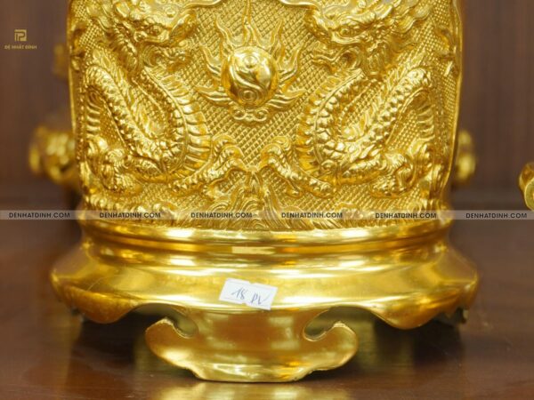 Bộ đỉnh đồng ngũ sự Cuốn Thư 65 dát vàng 24K cùng ống hương, mâm bồng, bát hương, chén thờ không chỉ là một bộ đồ thờ cúng thông thường, mà nó còn là một tác phẩm nghệ thuật. Với thiết kế họa tiết song long tinh xảo và lớp dát vàng sáng bóng, bộ sản phẩm này sẽ mang lại một không gian thờ cúng sang trọng và hiện đại. Khi đặt trong nhà, nó không chỉ thể hiện sự tôn kính với tổ tiên mà còn tăng cường vẻ đẹp thẩm mỹ cho toàn bộ không gian.