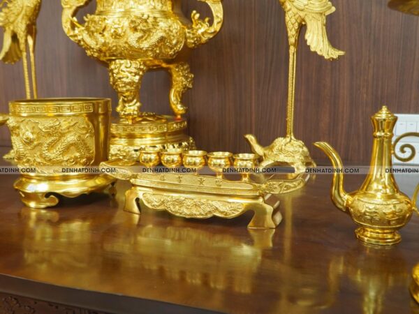 Tất cả các sản phẩm trong bộ ngũ sự này đều được làm từ chất liệu đồng catut cao cấp, đảm bảo độ bền và chống gỉ sét hiệu quả. Việc dát vàng 24k thêm tăng cường vẻ đẹp và giá trị của sản phẩm.