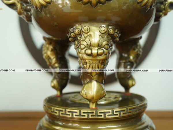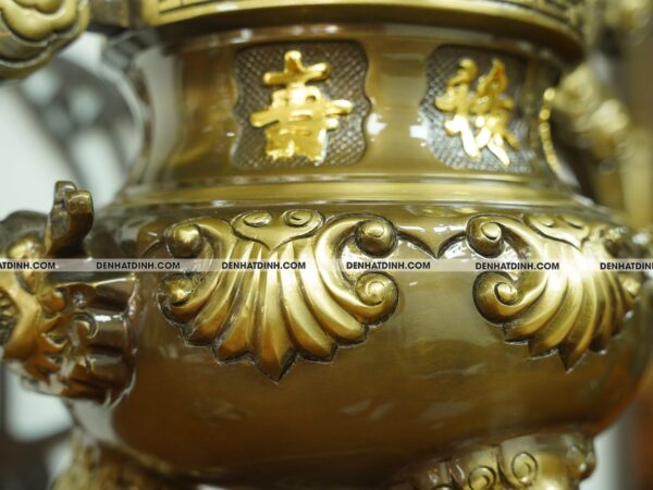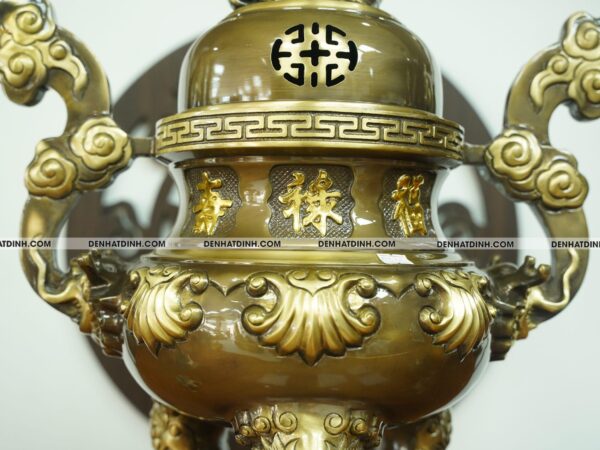 – Đỉnh đồng: Mẫu Bộ đỉnh đồng ngũ sự hoa sòi 65 hoa văn CN trên bàn thờ được đúc theo dáng bầu tròn truyền thống với nắp đỉnh có hình Nghê đang vờn cầu, thân đỉnh được đúc nổi với hoạ tiết hoa sòi nổi bật. Phần cổ đỉnh được dát vàng với chữ Phúc Lộc Thọ. Thân đỉnh được đúc liền khối với tai đỉnh có thiết kế hình vân mây cách điệu và 3 chân đỉnh có hình đầu Nghê. Đế đỉnh được đúc rời dạng tròn với nhiều hoa văn được đúc chạm khắc tinh xảo.