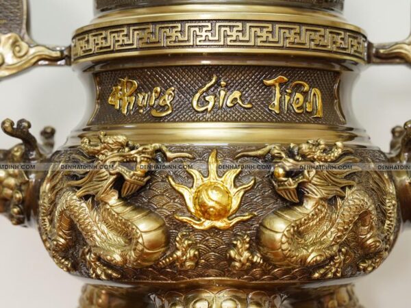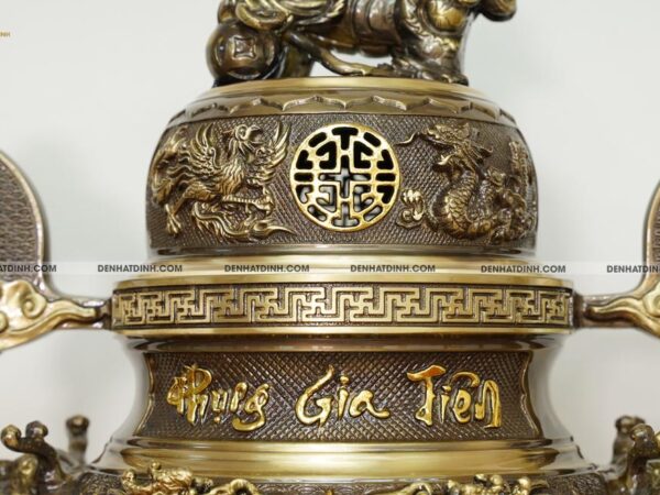 Lần đầu tiên tại Việt Nam, trên nắp quả đỉnh được chạm khắc Tứ Linh: Long – Ly – Quy – Phụng. Đây là kỹ thuật cực kỳ khó mà các cơ sở nhỏ lẻ không ai dám làm. Bởi Tứ Linh muốn đúc nổi thì buộc độ dày của nắp phải gấp đôi hàng thường mới thành hình được.