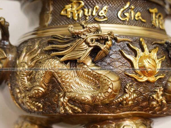 Lần đầu tiên tại Việt Nam, trên nắp quả đỉnh được chạm khắc Tứ Linh: Long – Ly – Quy – Phụng. Đây là kỹ thuật cực kỳ khó mà các cơ sở nhỏ lẻ không ai dám làm. Bởi Tứ Linh muốn đúc nổi thì buộc độ dày của nắp phải gấp đôi hàng thường mới thành hình được.