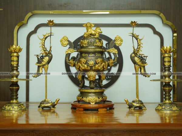 Tên Sản Phẩm: Bộ đỉnh đồng ngũ sự Phụng Gia Tiên 65 dát vàng điểm hoa văn