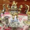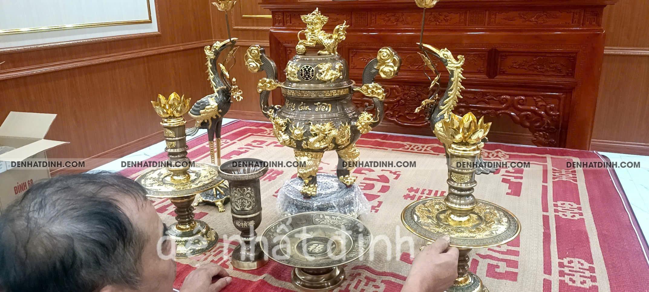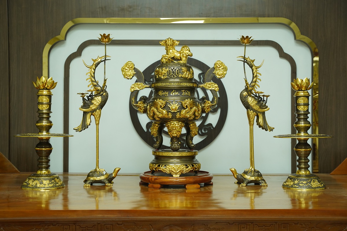 Tên Sản Phẩm: Bộ đỉnh đồng ngũ sự Phụng Gia Tiên 65 dát vàng điểm hoa văn