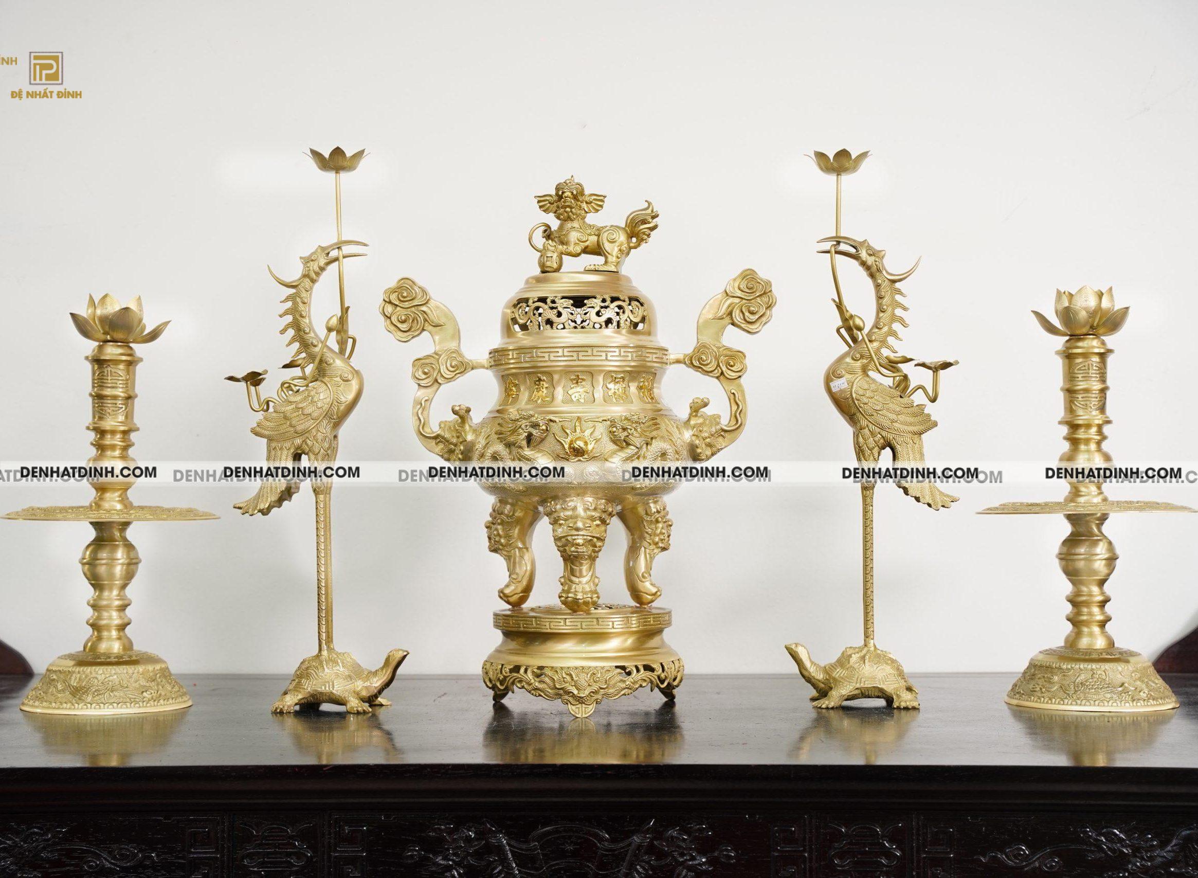 - Vị trí đặt bộ ngũ sự trên bàn thờ: Bộ ngũ sự thường được đặt tại vị trí trung tâm của bàn thờ để tạo sự cân bằng và trang nghiêm. Đỉnh đồng thường đặt ở giữa, phía sau bát hương, tạo điểm nhấn chính trong không gian thờ tự. Hai chân nến được đặt đối xứng hai bên đỉnh đồng để tạo sự hài hòa về bố cục. Đôi hạc thờ được đặt cạnh chân nến hoặc trước đỉnh đồng, tùy theo thiết kế và diện tích bàn thờ.