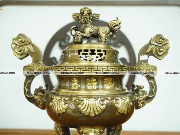 Bộ 3 chân quỳ tam lân trấn giữ trọng lượng cả bộ đỉnh nên được đúc liền nguyên khối. Với thiết kế này, gia chủ yên tâm thờ phụng mà không lo độ nóng của hương hỏa trên ban có thể làm lung lay các mối hàn hay ốc vít như những loại hàng đồng Đài Loan rẻ tiền hay gặp phải.