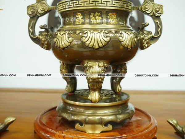 Bộ 3 chân quỳ tam lân trấn giữ trọng lượng cả bộ đỉnh nên được đúc liền nguyên khối. Với thiết kế này, gia chủ yên tâm thờ phụng mà không lo độ nóng của hương hỏa trên ban có thể làm lung lay các mối hàn hay ốc vít như những loại hàng đồng Đài Loan rẻ tiền hay gặp phải.