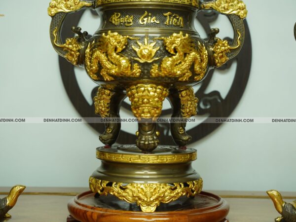 Với thiết kế tinh xảo và bề mặt dát vàng 24k, bộ đỉnh đồng không chỉ làm tăng vẻ đẹp cho không gian thờ cúng mà còn thể hiện sự tôn kính và trang nghiêm.