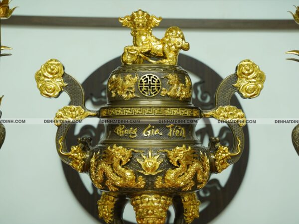 Với thiết kế tinh xảo và bề mặt dát vàng 24k, bộ đỉnh đồng không chỉ làm tăng vẻ đẹp cho không gian thờ cúng mà còn thể hiện sự tôn kính và trang nghiêm.