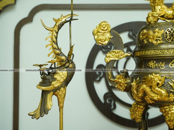 Bộ đỉnh đồng tam sự hạc phụng nến gia tiên 65 dát vàng điểm hoa văn là một trong những lựa chọn hàng đầu cho những gia đình muốn trang trí và tôn vinh không gian thờ cúng của mình. Với thiết kế tinh xảo, chất liệu cao cấp và ý nghĩa phong thủy sâu sắc, bộ đỉnh đồng này không chỉ mang lại vẻ đẹp thẩm mỹ mà còn góp phần tạo ra một không gian thờ cúng trang nghiêm và thanh tịnh.