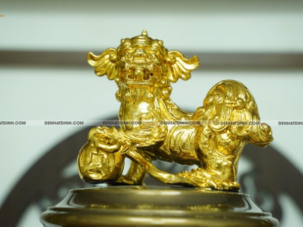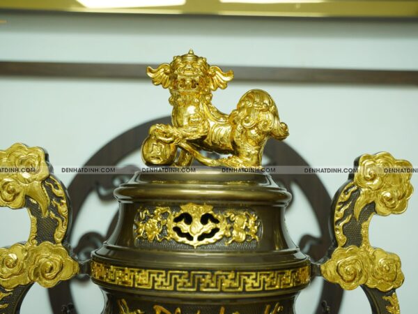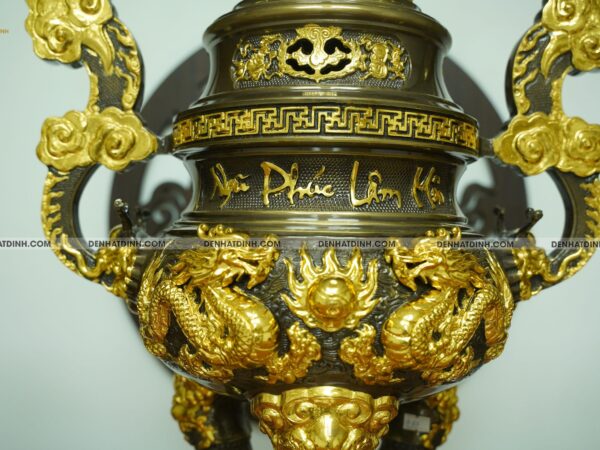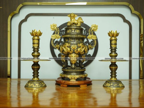 – Đỉnh đồng: Mẫu bộ đỉnh đồng tam sự nến hoa văn Ngũ Phúc Lâm Môn 65 dát vàng điểm trên bàn thờ được đúc theo dáng bầu tròn truyền thống với nắp đỉnh có hình Nghê đang vờn cầu, thân đỉnh được dát vàng với hoạ tiết Song Long Chầu Nguyệt bằng chất liệu vàng. Phần cổ đỉnh được dát vàng với chữ Ngũ Phúc Lâm Môn. Thân đỉnh được đúc liền khối với tai đỉnh có thiết kế hình vân mây cách điệu và 3 chân đỉnh có hình đầu Nghê. Đế đỉnh được đúc rời dạng tròn với nhiều hoa văn được đúc chạm khắc tinh xảo.
