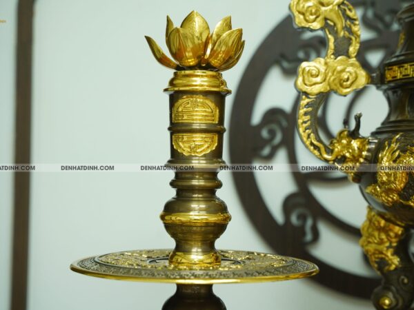 – Đôi chân nến: Mẫu chân nến được đúc dạng ống tròn trơn, thắt eo nhiều chỗ, phía trên đỉnh nến có đặt một bông sen bằng đồng. Thân nến và lá nến được đúc chữ Phúc và đĩa nến được đúc nổi rồng phượng và chân nến chạm khắc Long Ly Quy Phụng. Họa tiết hoa văn nổi bật được dát vàng làm điểm nhấn cho đôi chấn nến thêm phần sang trọng và bền màu theo thời gian