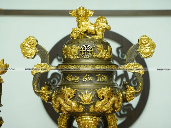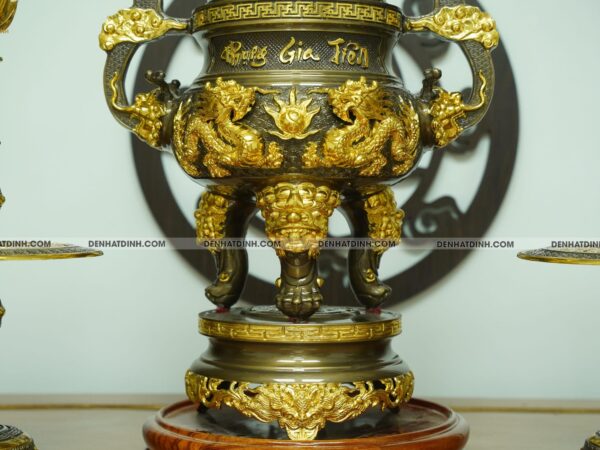 Các chi tiết dát vàng trên bộ đỉnh đồng tam sự 65 làm nổi bật vẻ đẹp cao cấp và trang nhã.Bộ đỉnh đồng tam sự nến Phụng gia tiên 65 dát vàng điểm hoa văn không chỉ là một vật phẩm trang trí mà còn mang trong mình những giá trị tâm linh và phong thủy sâu sắc. Với thiết kế tinh xảo, chất liệu bền vững và ý nghĩa phong thủy tích cực, bộ sản phẩm này sẽ giúp tạo nên một không gian thờ cúng trang nghiêm, ấm cúng và thể hiện lòng thành kính của con cháu đối với tổ tiên.