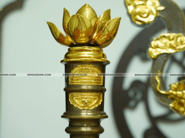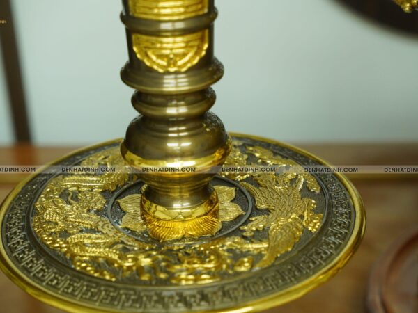 Đôi chân nến cao 51cm đồng bộ về kiểu dáng và phong cách, cũng được chế tác từ đồng cattut cao cấp, nổi bật với các chi tiết dát vàng điểm khéo léo. Mỗi chân nến là sự kết hợp của tứ linh long, lân, quy, phụng được chạm khắc tỉ mỉ ở phần đế và thân nến, thể hiện sự bảo hộ tâm linh và phúc khí gia đình. Phần đĩa nến rộng rãi được chạm khắc họa tiết rồng phượng uốn lượn, mang ý nghĩa cao quý, kết nối trời đất và âm dương. Thân nến được thiết kế thon dần đều, với các đốt lượn sóng nhẹ nhàng tạo nên vẻ thanh thoát, sang trọng, rất phù hợp với không gian thờ tự cổ kính, uy nghi.