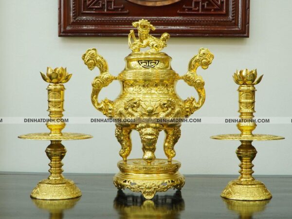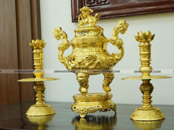 Bộ đỉnh tam sự nến song long 66 nắp Thọ dát vàng kín 24k – Tác phẩm nghệ thuật thờ cúng cao cấp