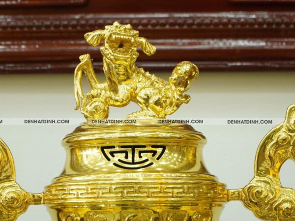 Nắp đỉnh nổi bật với biểu tượng chữ Thọ nằm giữa, xung quanh là họa tiết rồng uốn lượn, trên đỉnh nắp là tượng nghê đứng uy nghiêm. Nghê mang ý nghĩa trấn trạch, xua đuổi tà khí và mang lại bình an cho gia chủ.