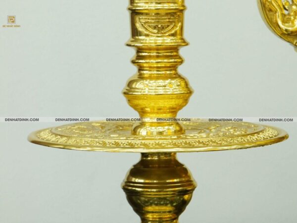 Hai chân nến cao 51cm, đế lớn vững chãi, thân nến tạo hình trụ đứng, chạm hoa văn nổi rõ ràng. Trên đầu nến là đài sen cách điệu, thể hiện cho sự thanh khiết và tinh tấn trong đạo lý nhà Phật. Khi thắp nến, ánh sáng chiếu qua lớp vàng giúp không gian thêm ấm cúng, linh thiêng.